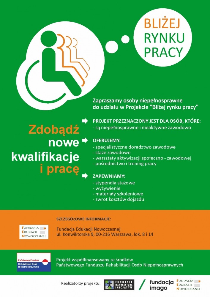 Zapraszamy dorosłe, nieaktywne zawodowo osoby z orzeczonym stopniem niepełnosprawności zamieszkałe na terenie województwa Mazowieckiego do udziału w bezpłatnym projekcie „Bliżej rynku pracy” – współfinansowanego przez Państwowy Fundusz Rehabilitacji Osób Niepełnosprawnych.