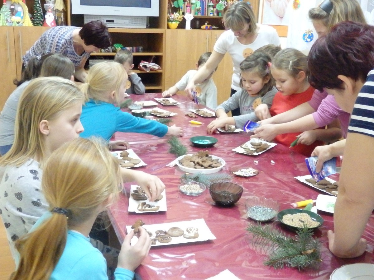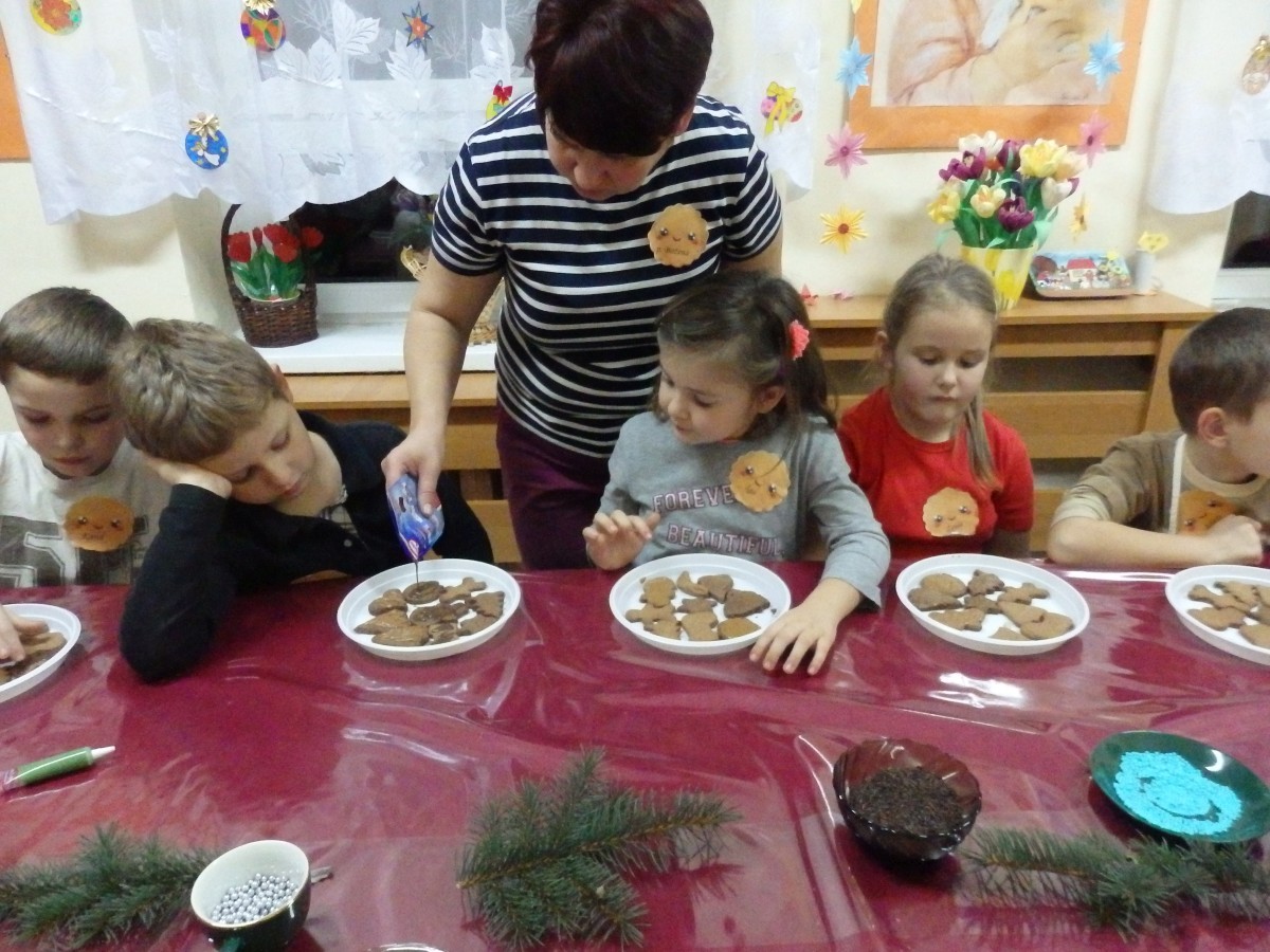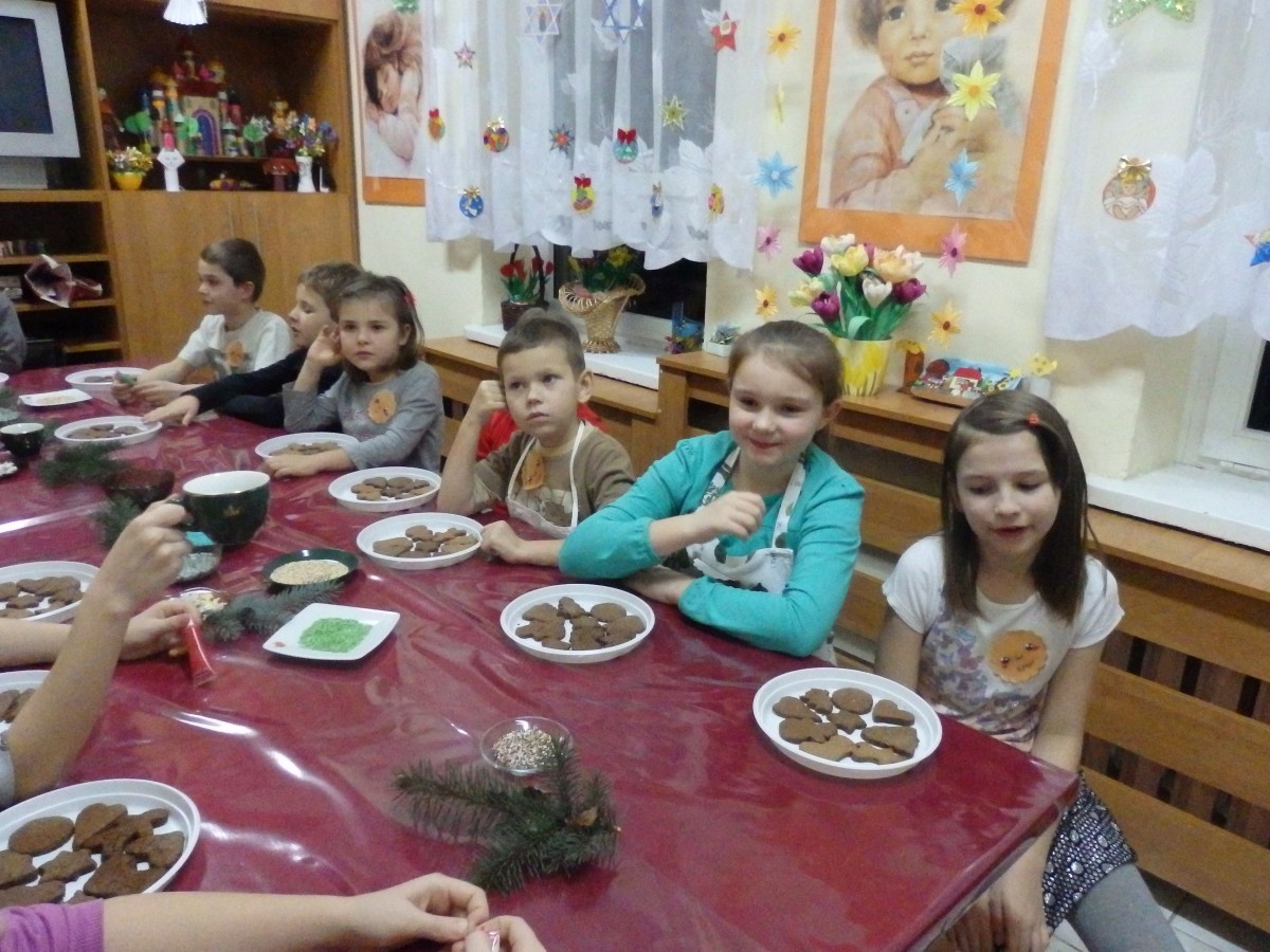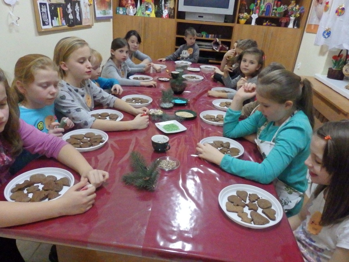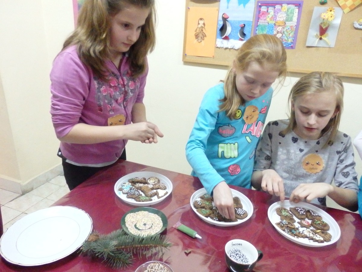 Podczas pracy dzieci śpiewały kolędy, co nas wprowadziło w świąteczny nastrój, a zapach pierników było czuć na całym Dobrem. Własnoręcznie zrobione i pięknie udekorowane pierniczki każdy z uczestników zajęć mógł zabrać do domu, aby zdobiły wigilijne stoły.