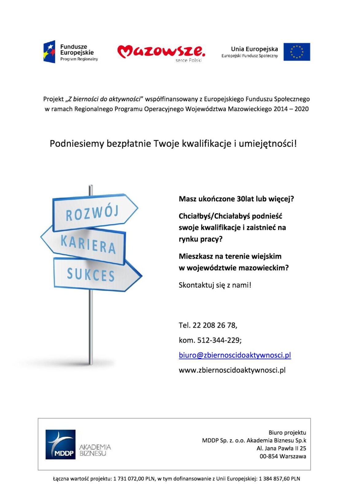 w nawiązaniu do rozmowy telefonicznej zapraszamy do udziału w projekcie „Z bierności do aktywności” współfinansowanego ze środków Europejskiego Funduszu Społecznego w ramach Programu Operacyjnego Wiedza Edukacja Rozwój 2014 – 2020.