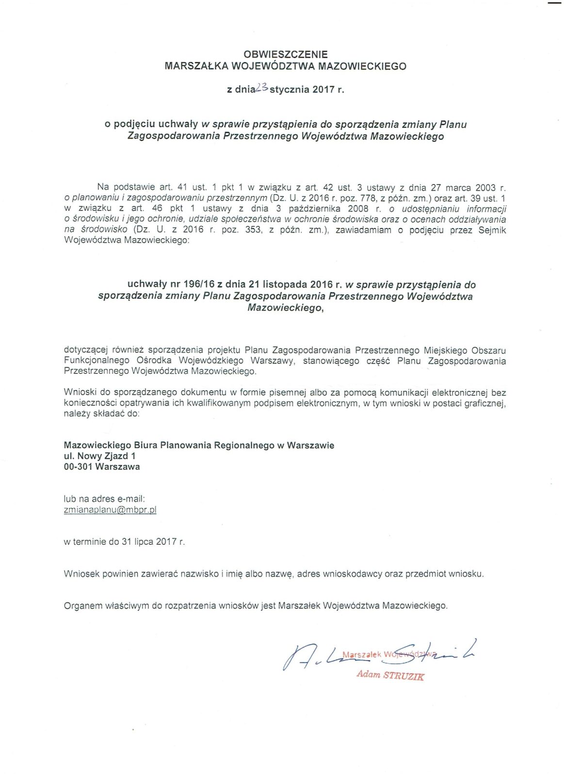 • Obwieszczenie w sprawie przystąpienia do sporządzenia zmiany Planu Zagospodarowania Przestrzennego Województwa Mazowieckiego
