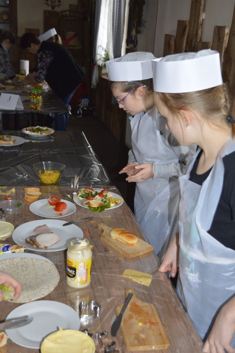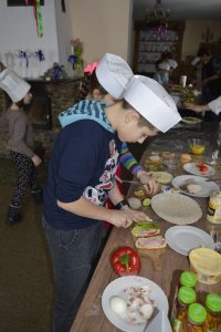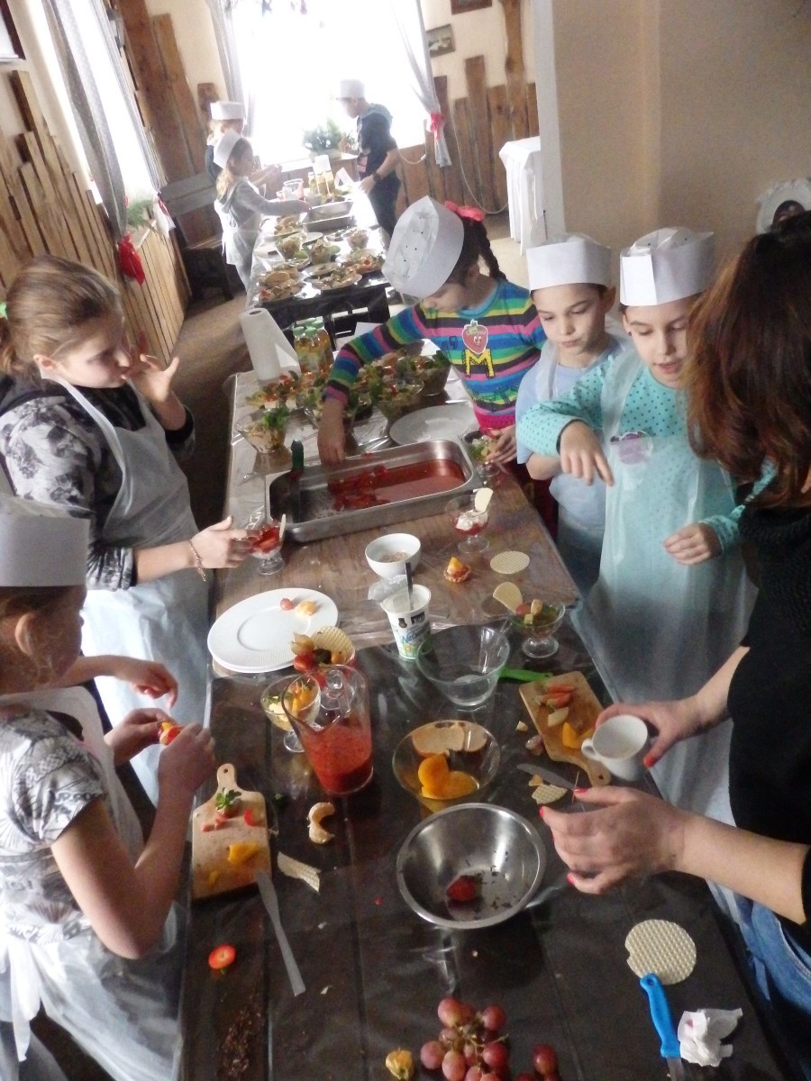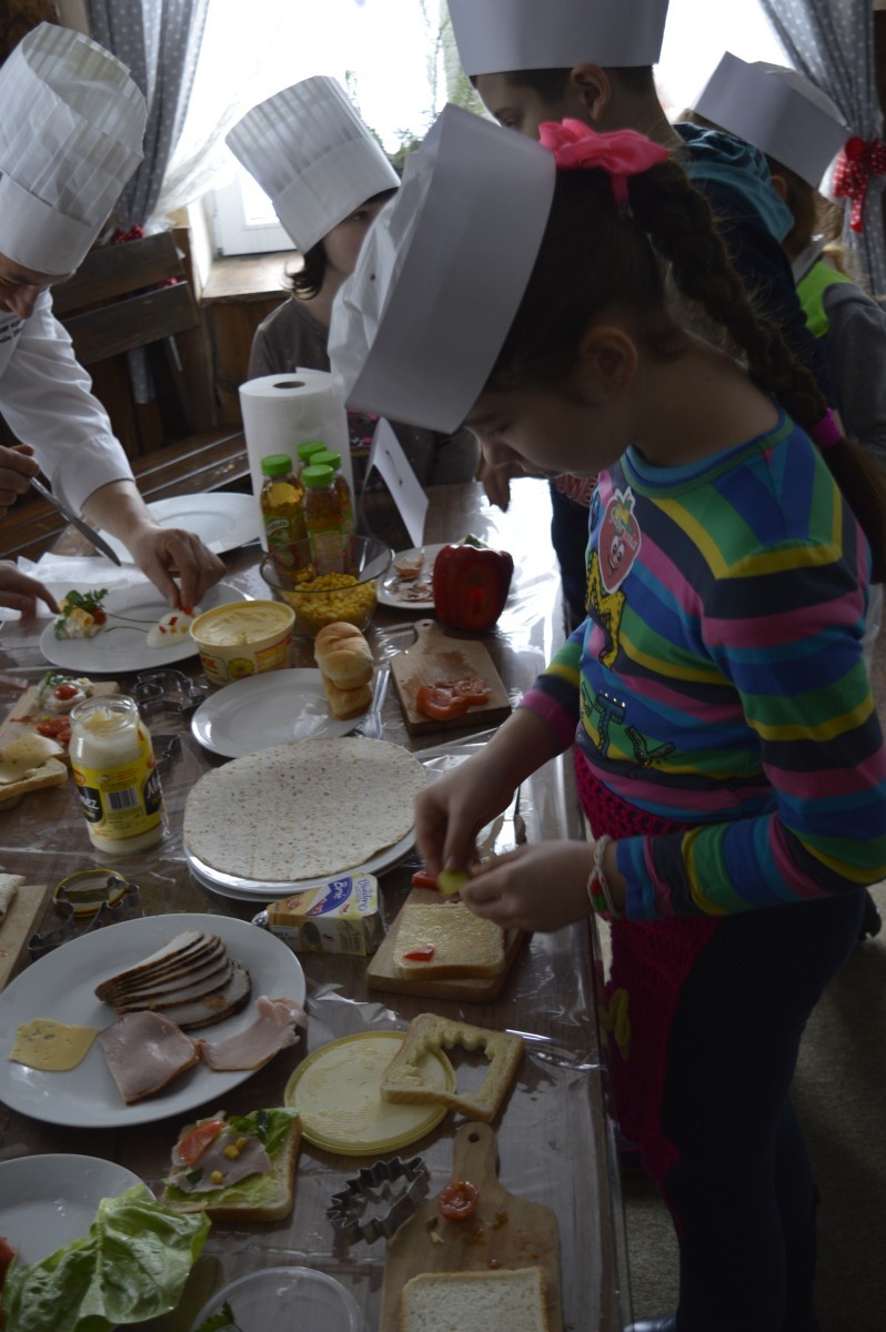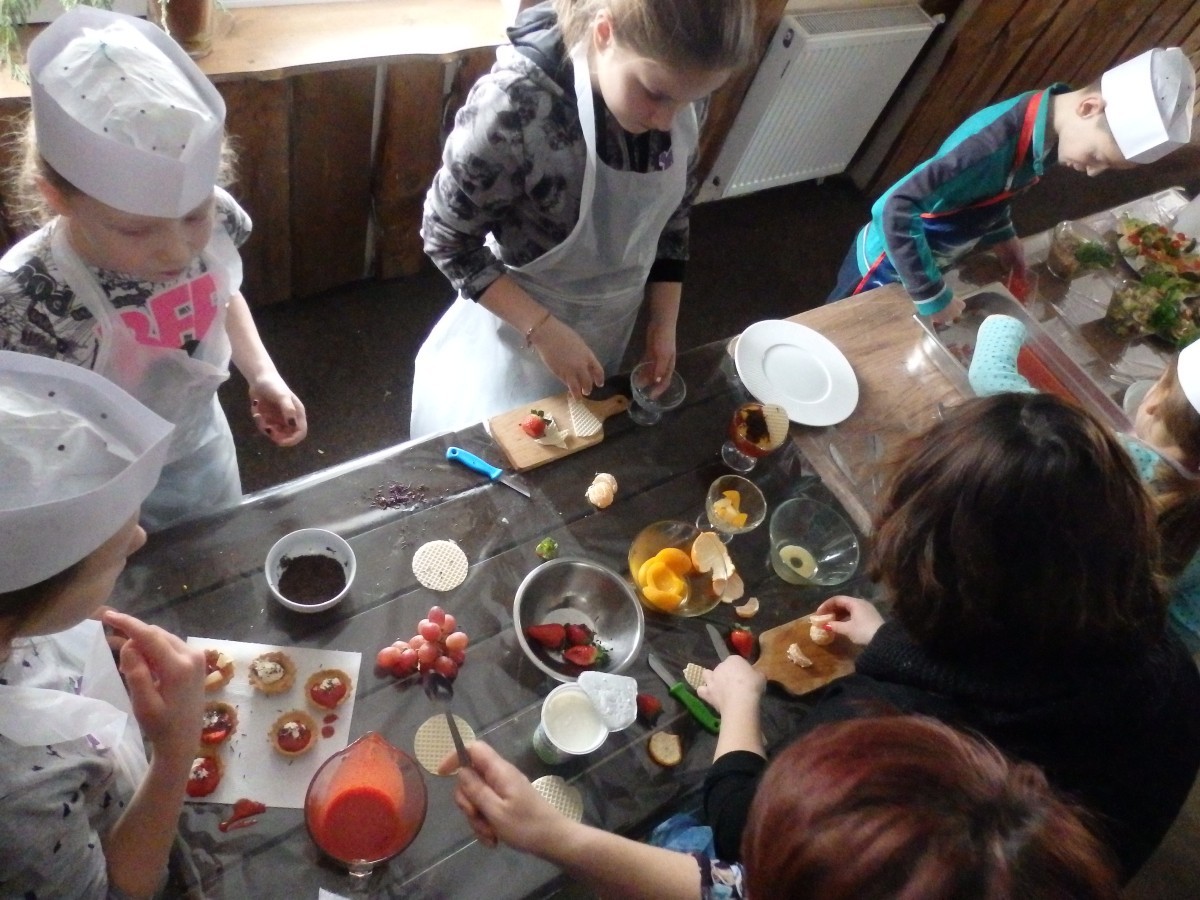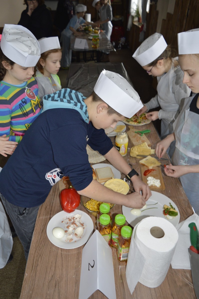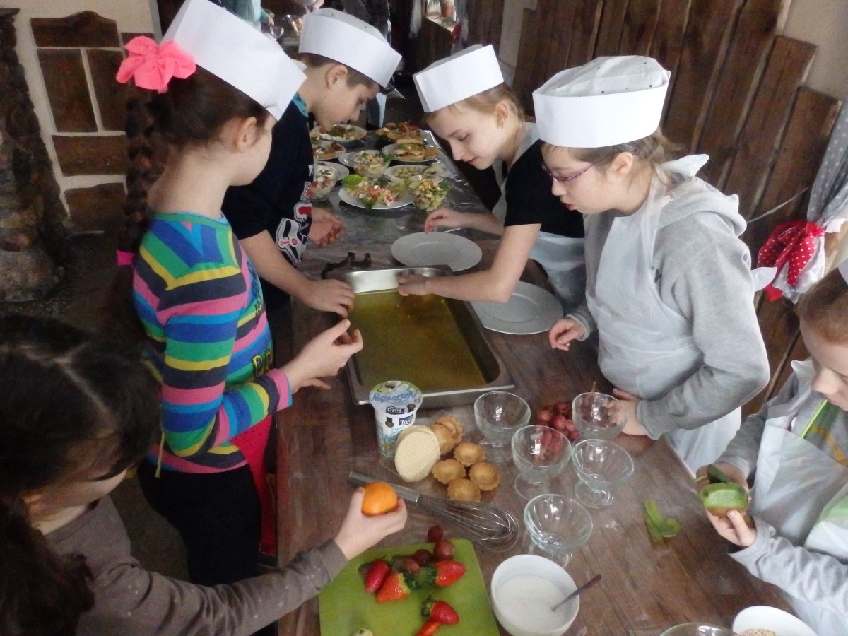 Gospodarz przygotował dla uczestników zajęć listę wyzwań. Trzy grupy rywalizowały w konkurencjach kulinarnych w kategoriach: kanapki, sałatki i desery. Dzieci udowodniły, że potrafią! Wyczarowały fantastyczne kanapki w kształcie myszki, jeżyka, żaglowca. Kolorowe sałatki świadczyły o pomysłowości i kreatywności uczestników. Desery potwierdziły wyjątkowe zdolności młodych kucharzy. Truskawkowe koktajle, galaretki z owocami, babeczki z bitą śmietaną nie miały sobie równych. Wszystko było pięknie podane i udekorowane.