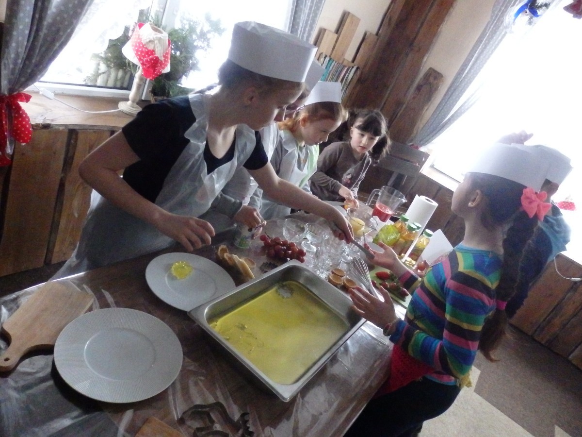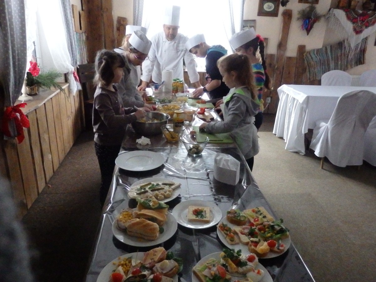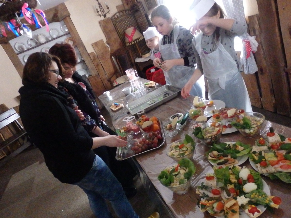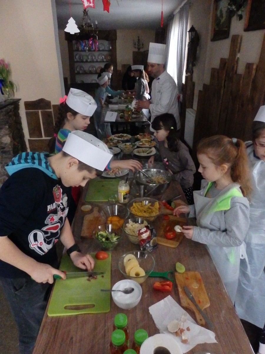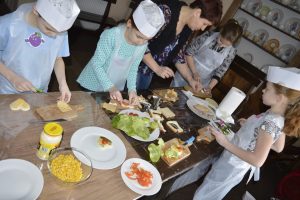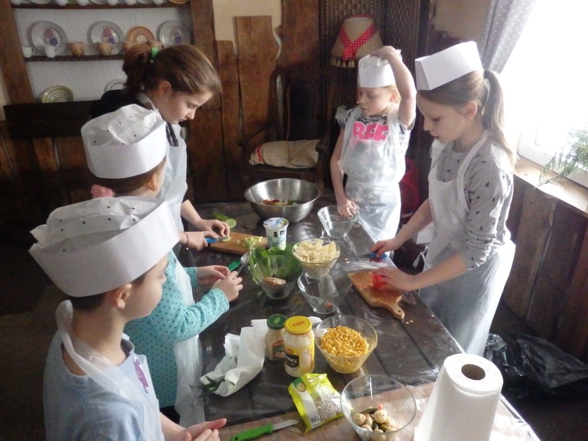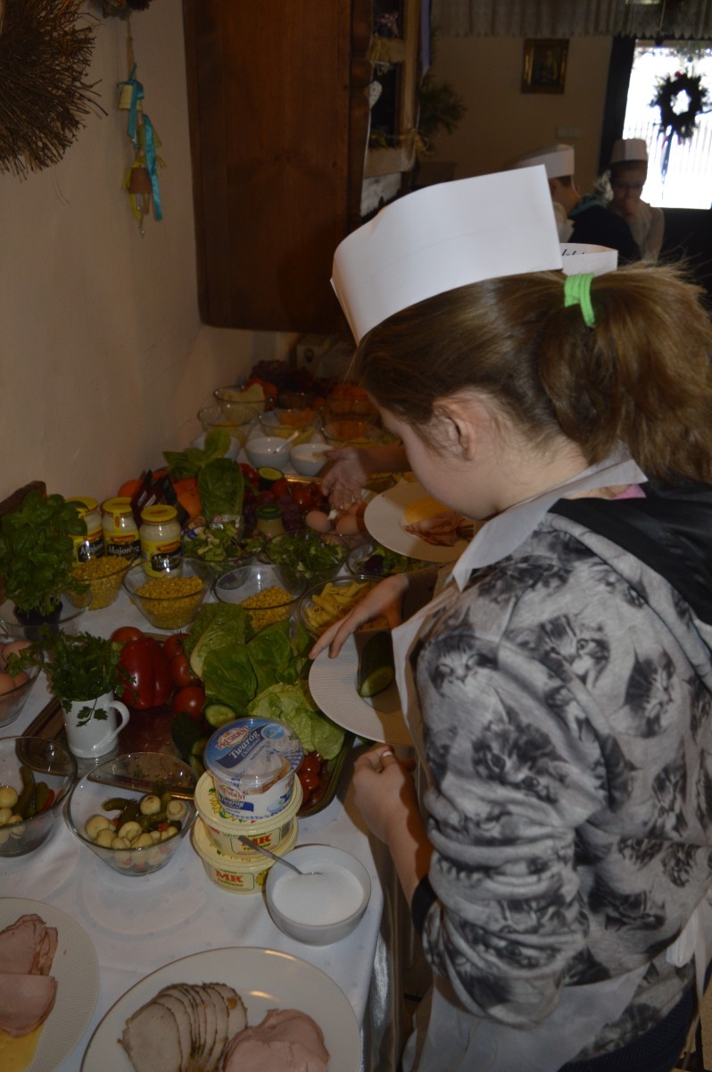Gospodarz przygotował dla uczestników zajęć listę wyzwań. Trzy grupy rywalizowały w konkurencjach kulinarnych w kategoriach: kanapki, sałatki i desery. Dzieci udowodniły, że potrafią! Wyczarowały fantastyczne kanapki w kształcie myszki, jeżyka, żaglowca. Kolorowe sałatki świadczyły o pomysłowości i kreatywności uczestników. Desery potwierdziły wyjątkowe zdolności młodych kucharzy. Truskawkowe koktajle, galaretki z owocami, babeczki z bitą śmietaną nie miały sobie równych. Wszystko było pięknie podane i udekorowane.