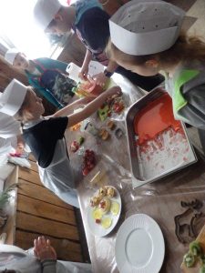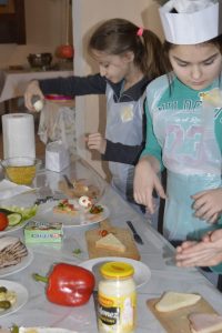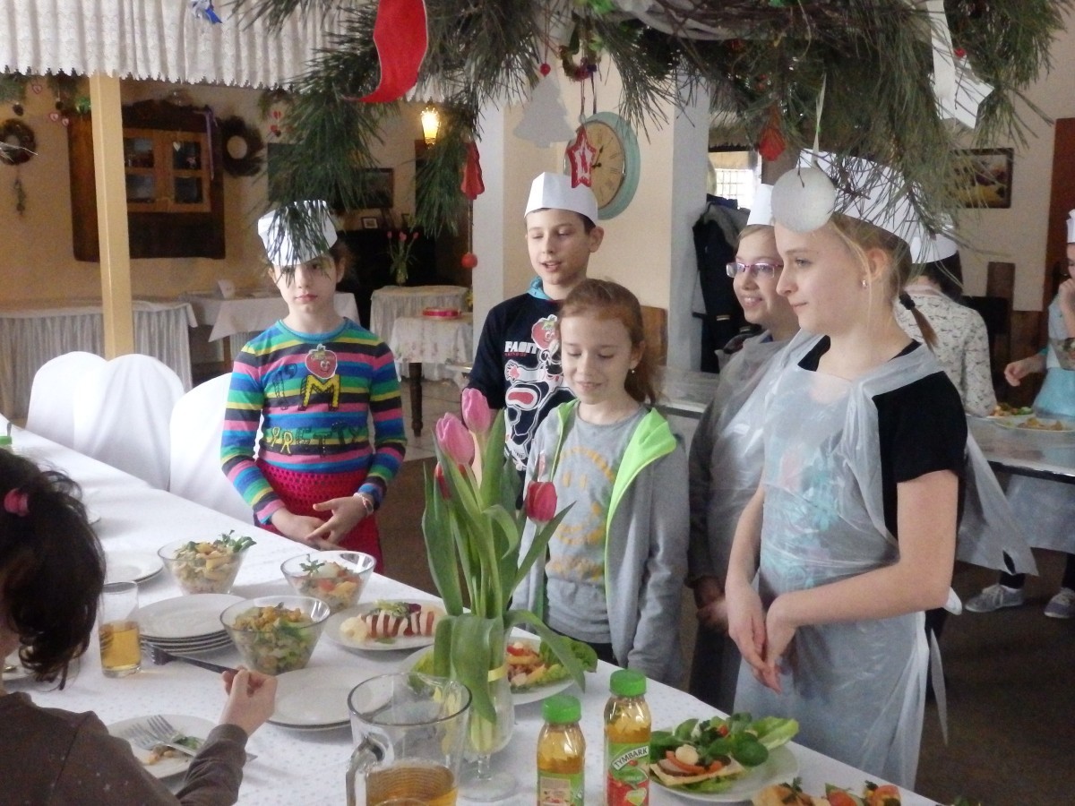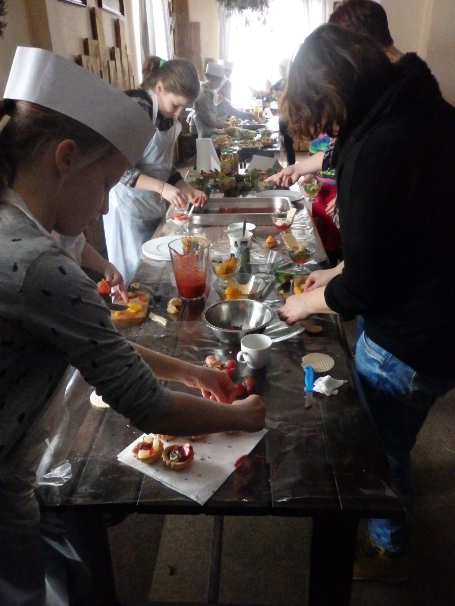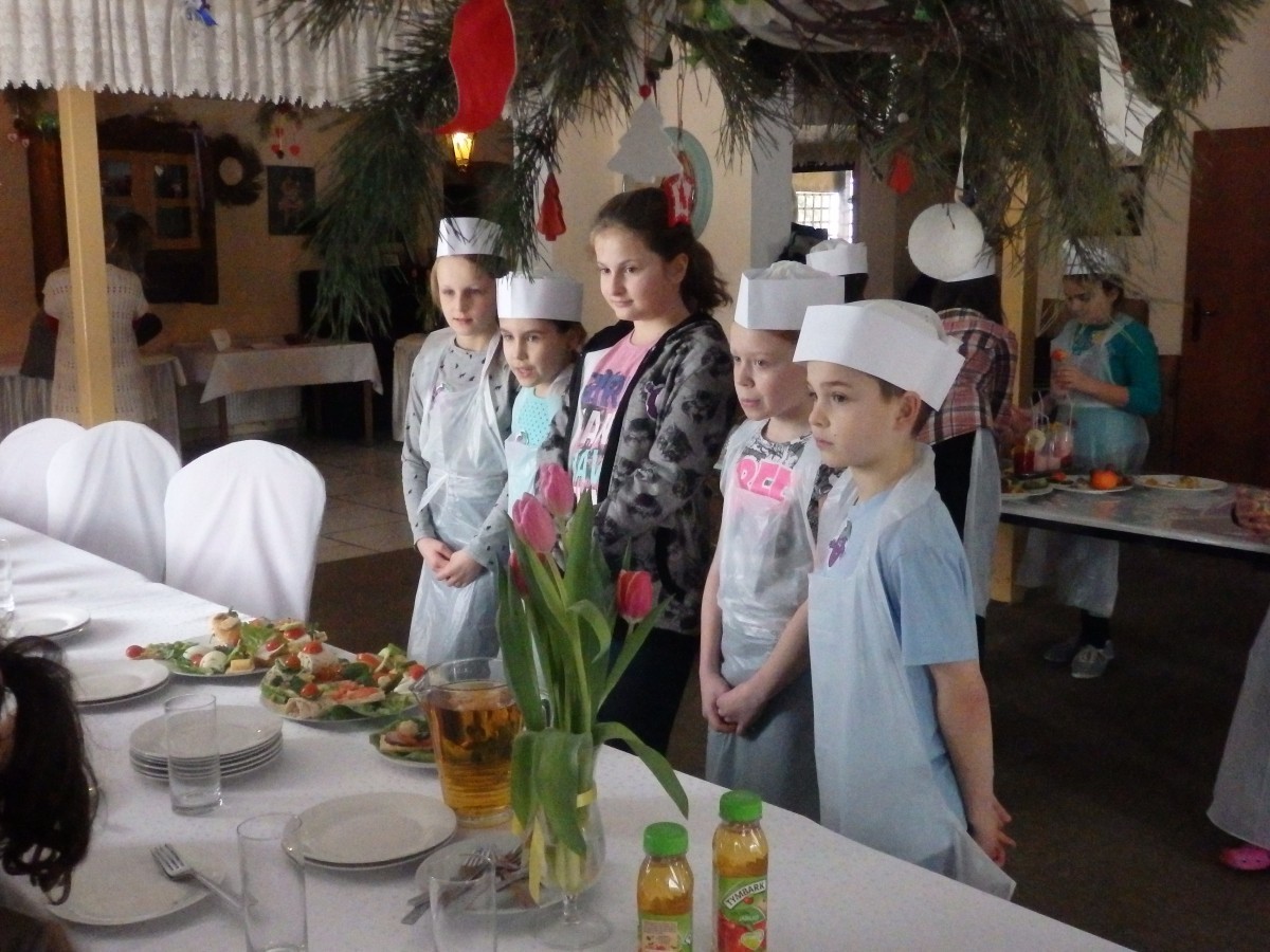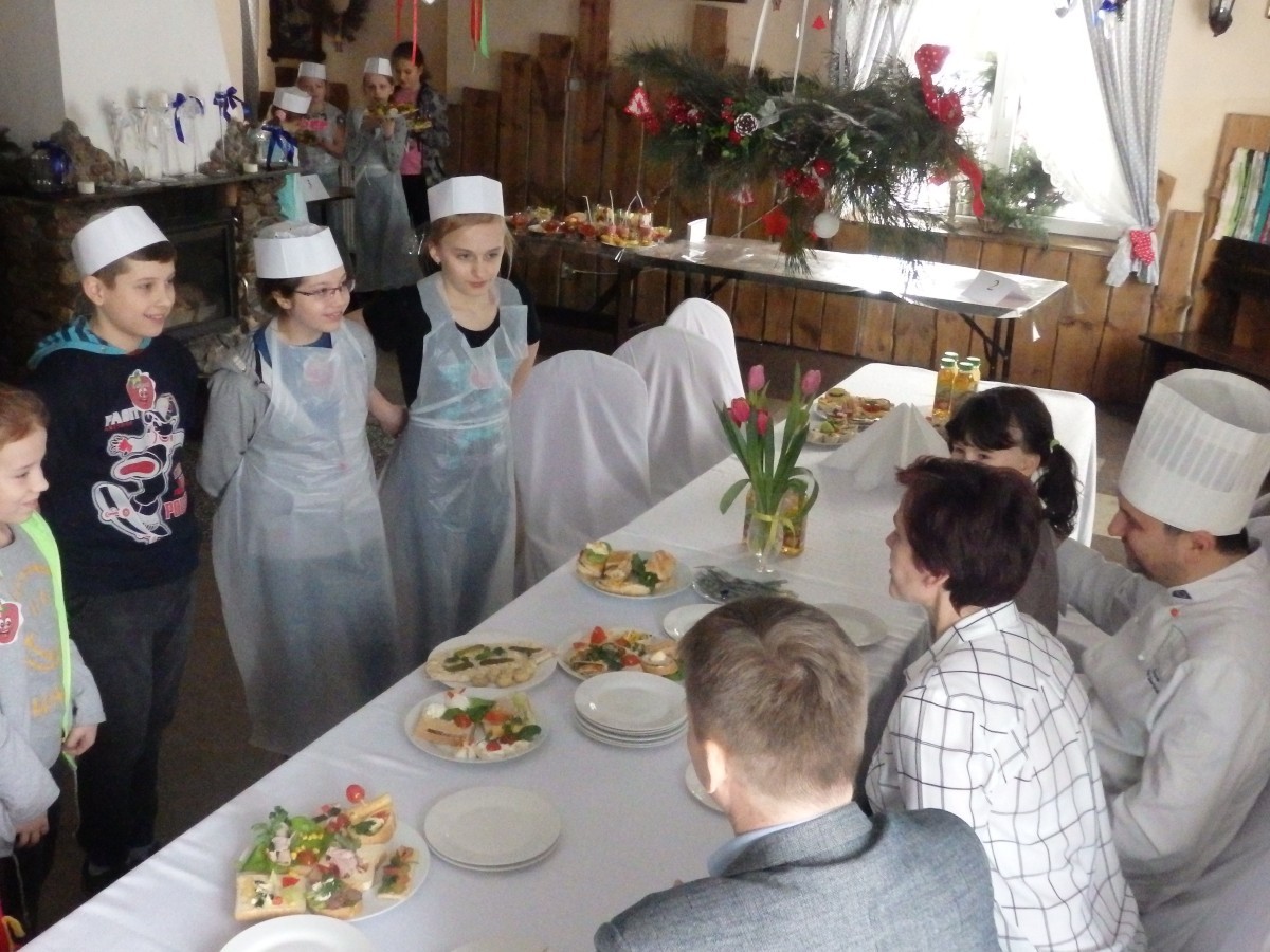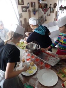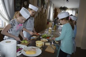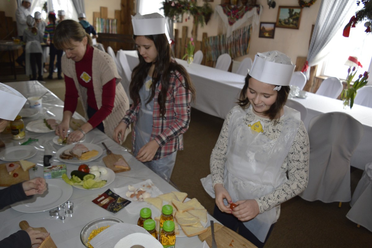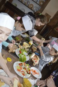 Gospodarz przygotował dla uczestników zajęć listę wyzwań. Trzy grupy rywalizowały w konkurencjach kulinarnych w kategoriach: kanapki, sałatki i desery. Dzieci udowodniły, że potrafią! Wyczarowały fantastyczne kanapki w kształcie myszki, jeżyka, żaglowca. Kolorowe sałatki świadczyły o pomysłowości i kreatywności uczestników. Desery potwierdziły wyjątkowe zdolności młodych kucharzy. Truskawkowe koktajle, galaretki z owocami, babeczki z bitą śmietaną nie miały sobie równych. Wszystko było pięknie podane i udekorowane.