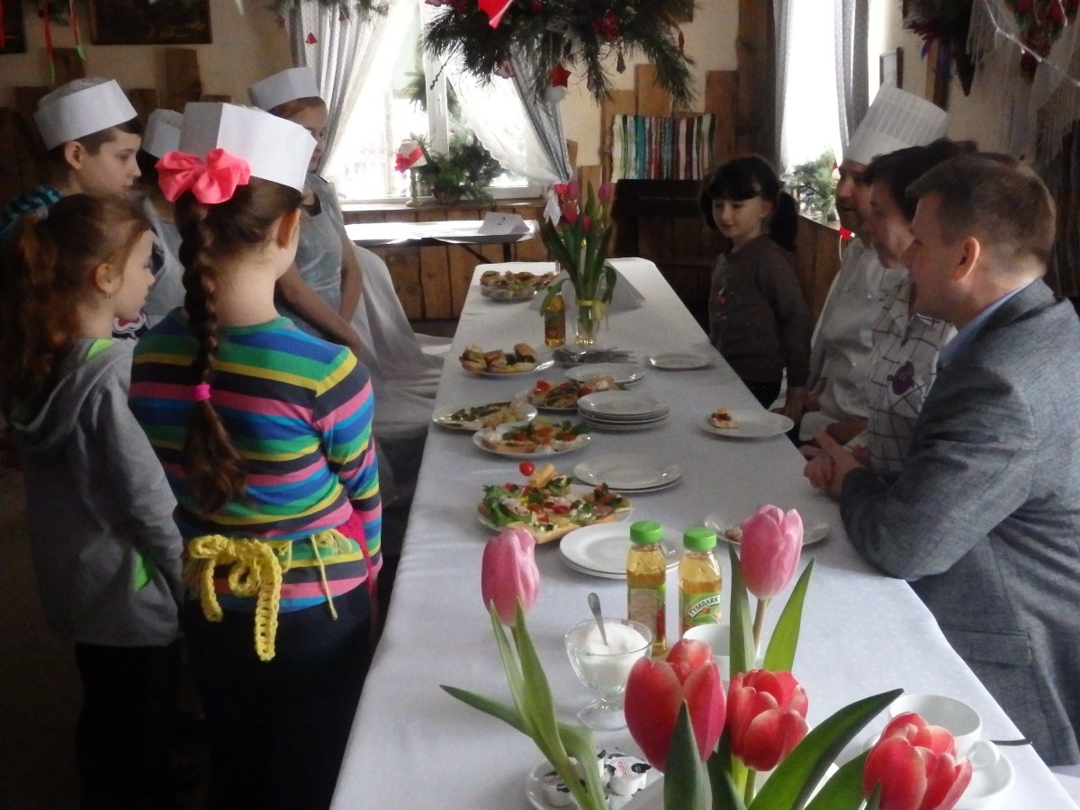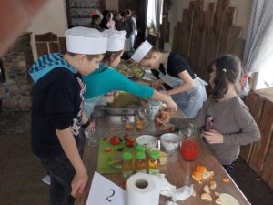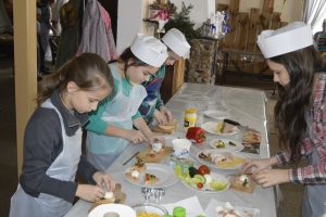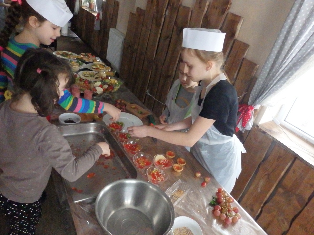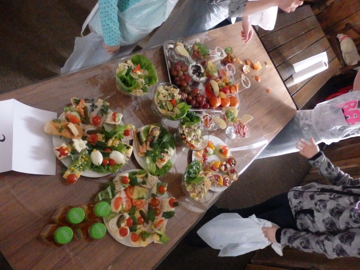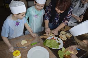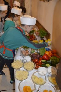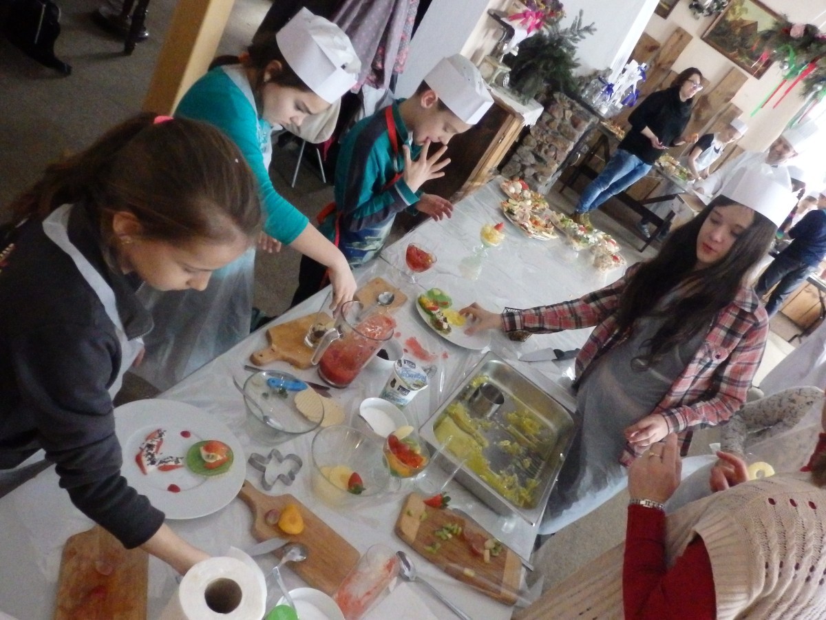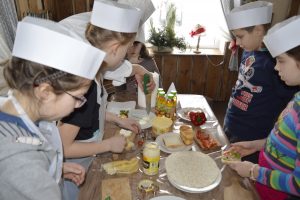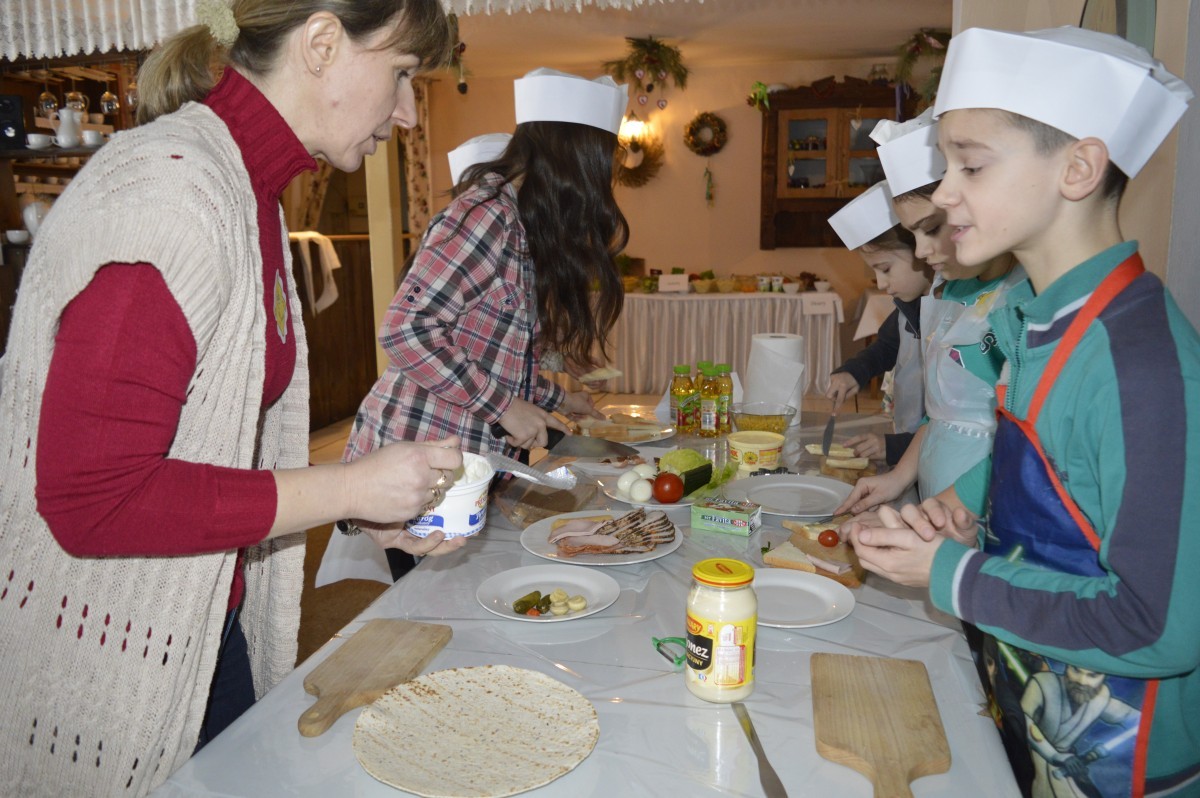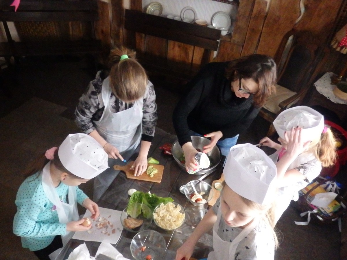 Gospodarz przygotował dla uczestników zajęć listę wyzwań. Trzy grupy rywalizowały w konkurencjach kulinarnych w kategoriach: kanapki, sałatki i desery. Dzieci udowodniły, że potrafią! Wyczarowały fantastyczne kanapki w kształcie myszki, jeżyka, żaglowca. Kolorowe sałatki świadczyły o pomysłowości i kreatywności uczestników. Desery potwierdziły wyjątkowe zdolności młodych kucharzy. Truskawkowe koktajle, galaretki z owocami, babeczki z bitą śmietaną nie miały sobie równych. Wszystko było pięknie podane i udekorowane.