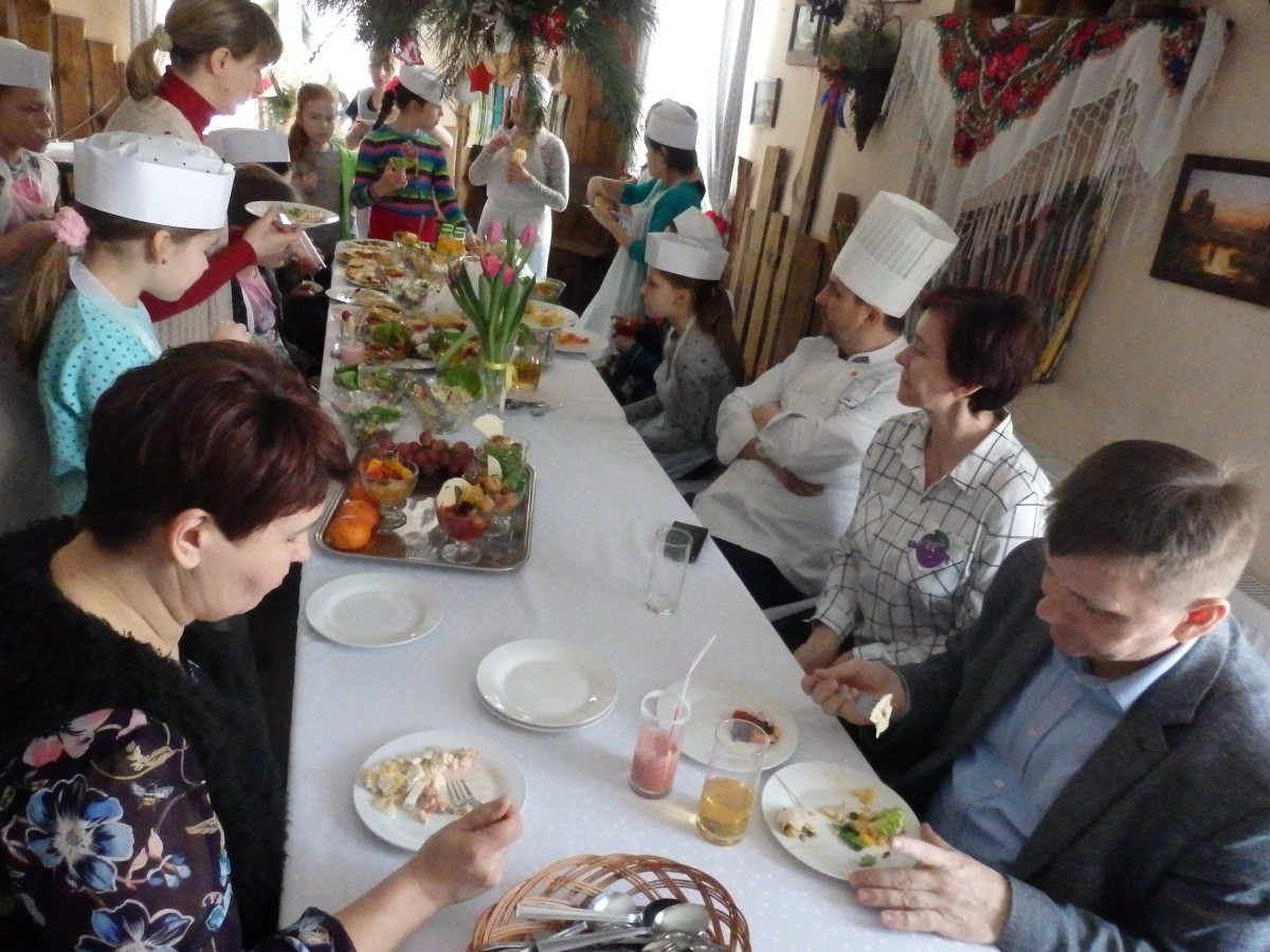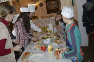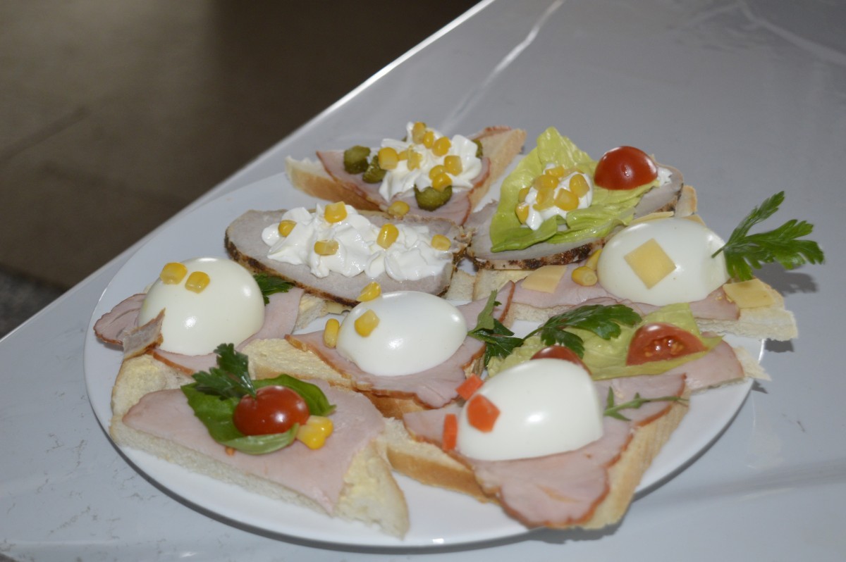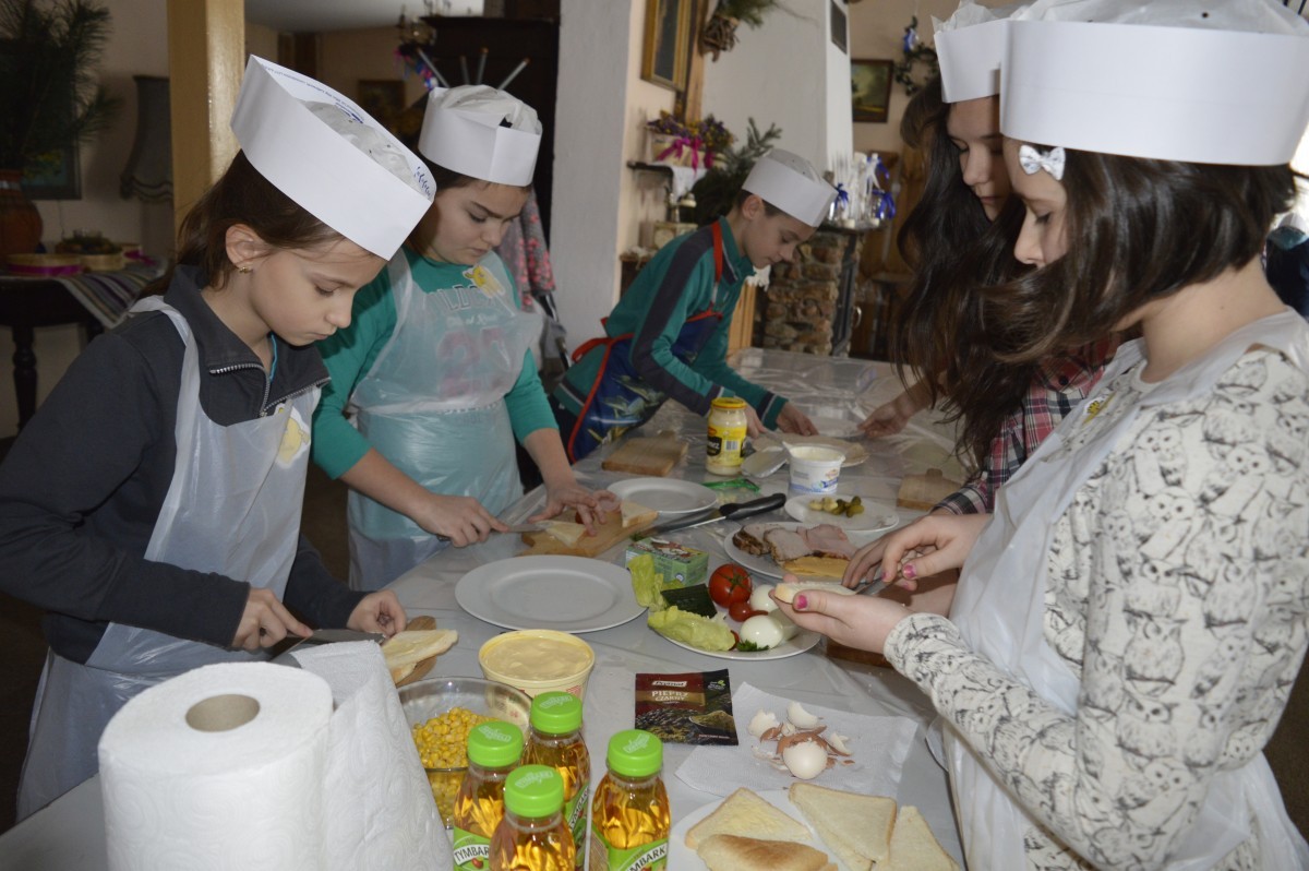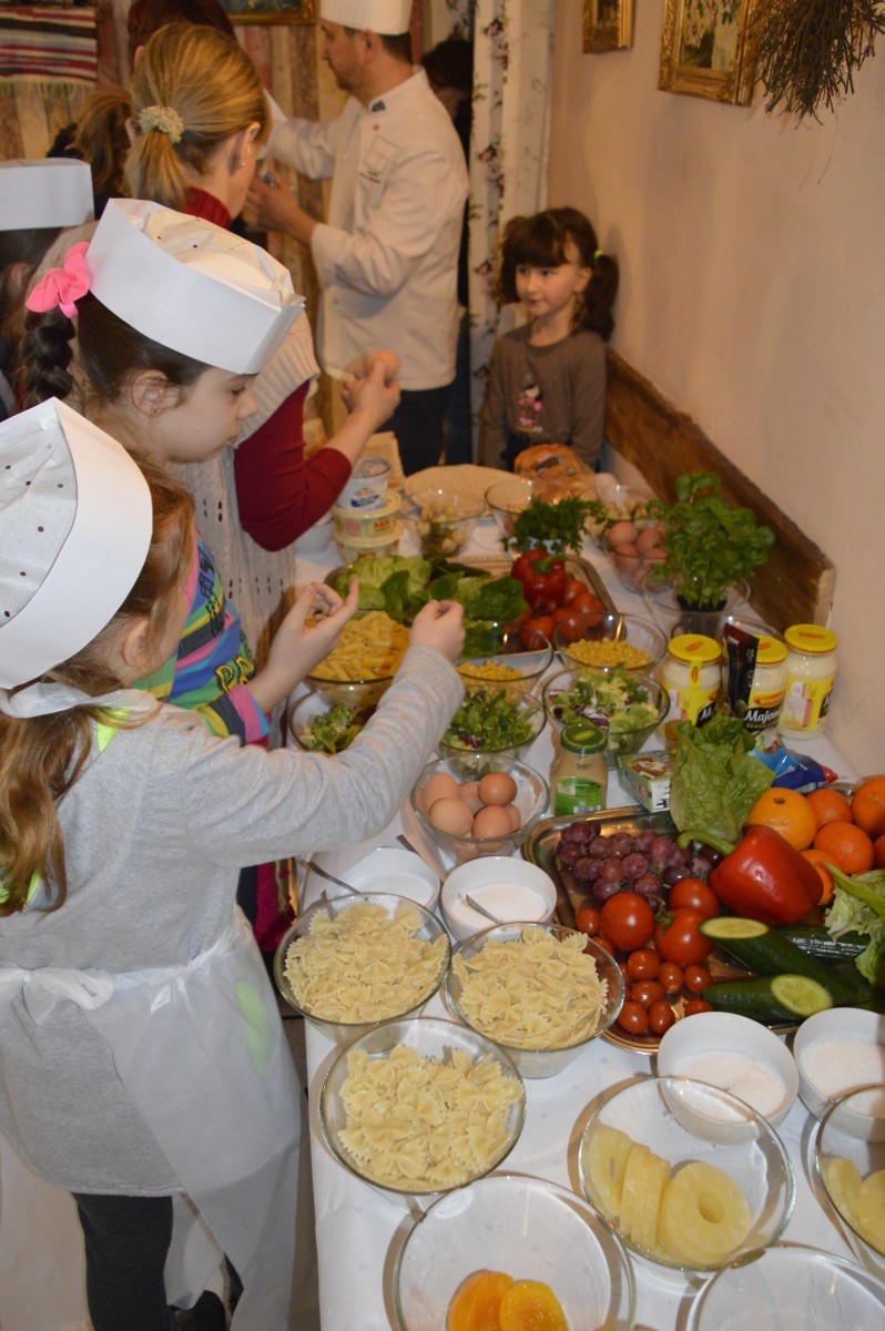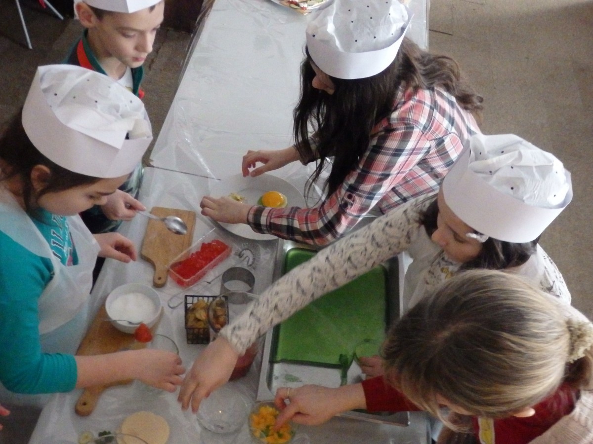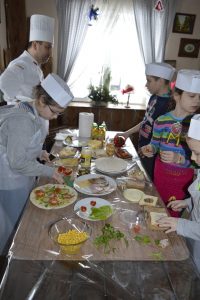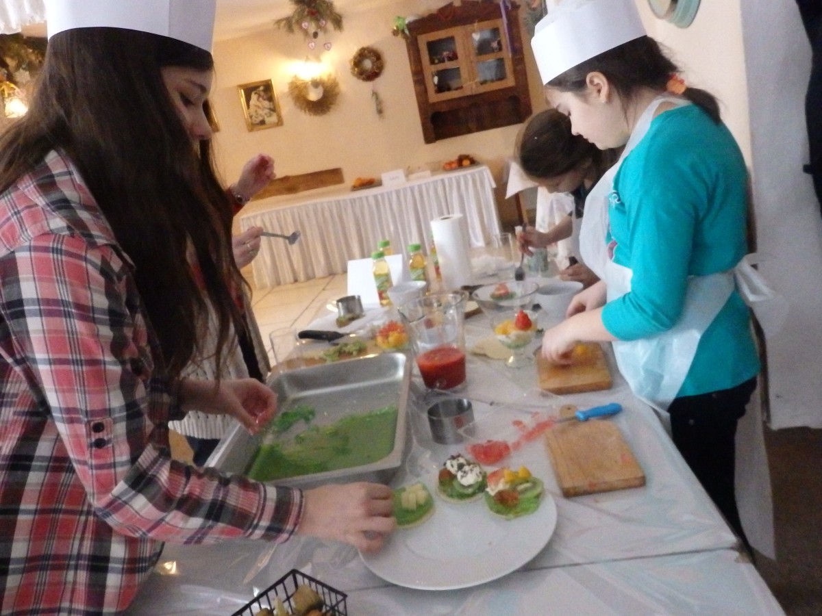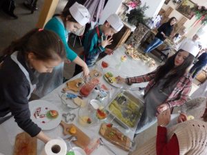 Gospodarz przygotował dla uczestników zajęć listę wyzwań. Trzy grupy rywalizowały w konkurencjach kulinarnych w kategoriach: kanapki, sałatki i desery. Dzieci udowodniły, że potrafią! Wyczarowały fantastyczne kanapki w kształcie myszki, jeżyka, żaglowca. Kolorowe sałatki świadczyły o pomysłowości i kreatywności uczestników. Desery potwierdziły wyjątkowe zdolności młodych kucharzy. Truskawkowe koktajle, galaretki z owocami, babeczki z bitą śmietaną nie miały sobie równych. Wszystko było pięknie podane i udekorowane.