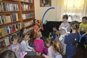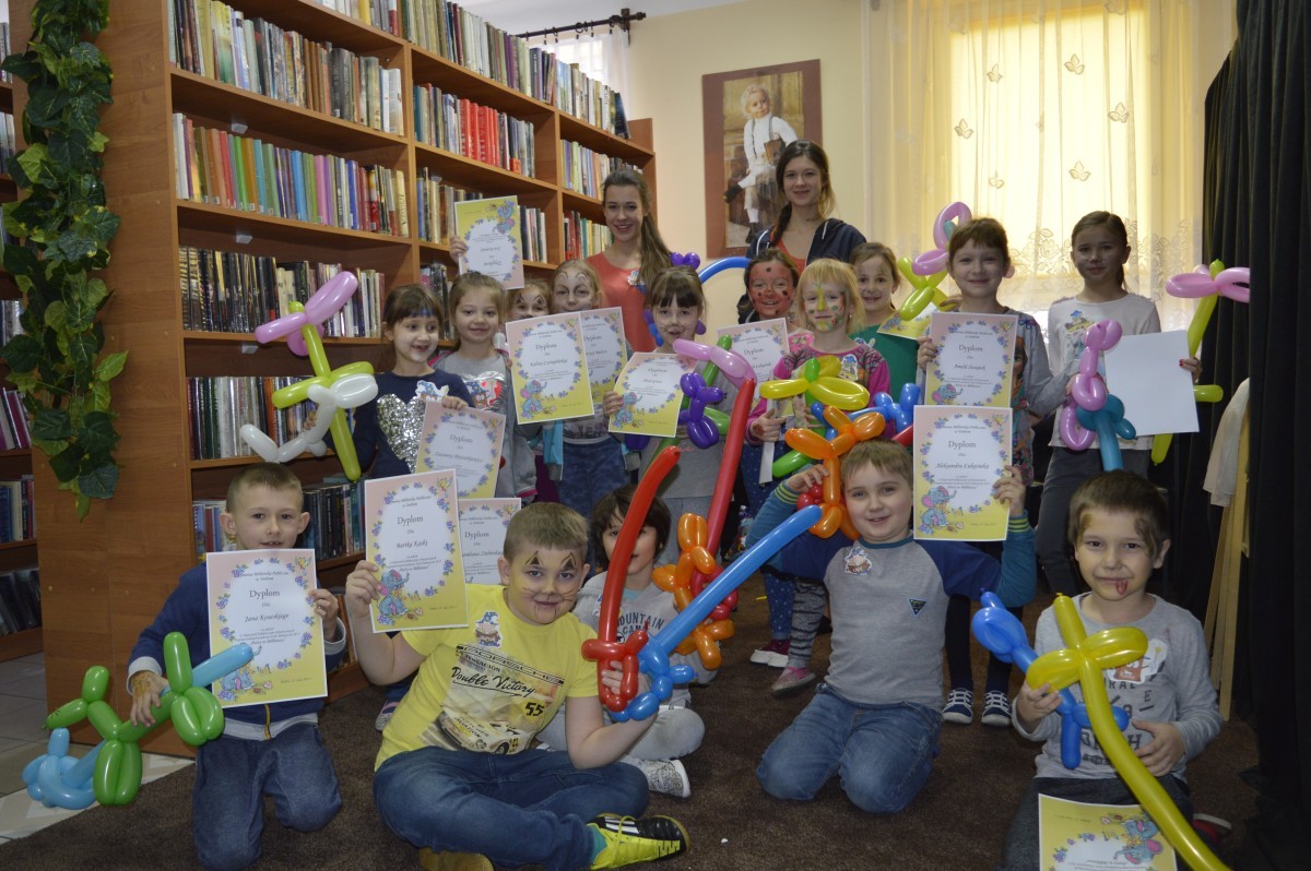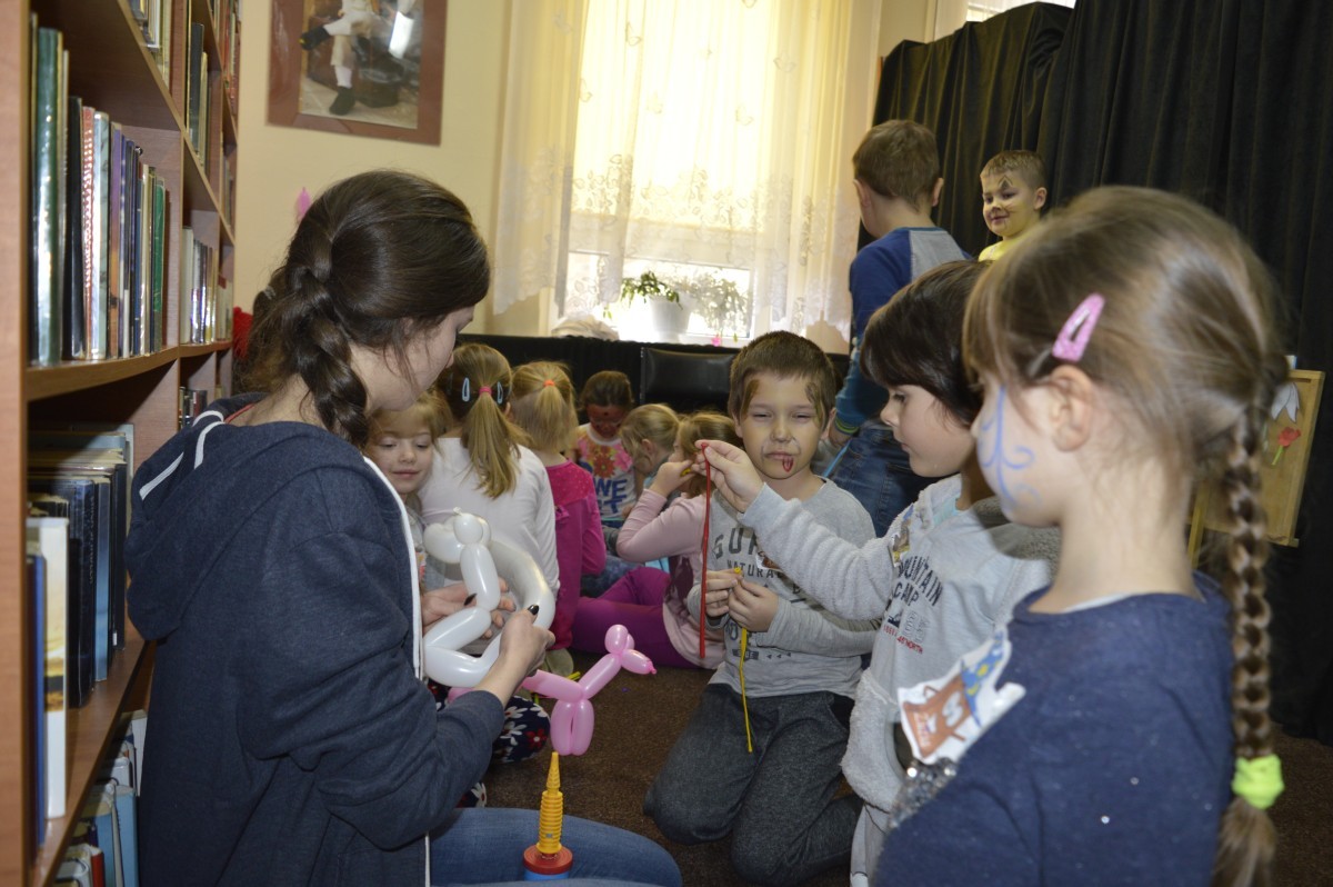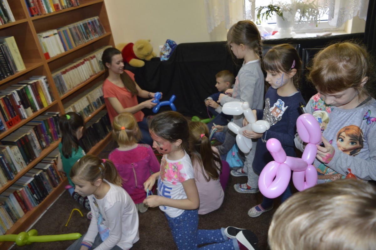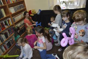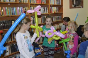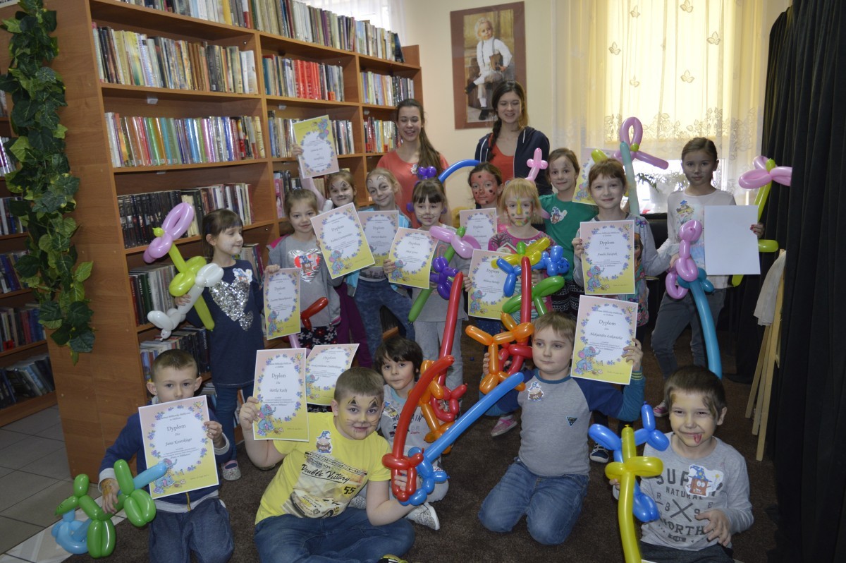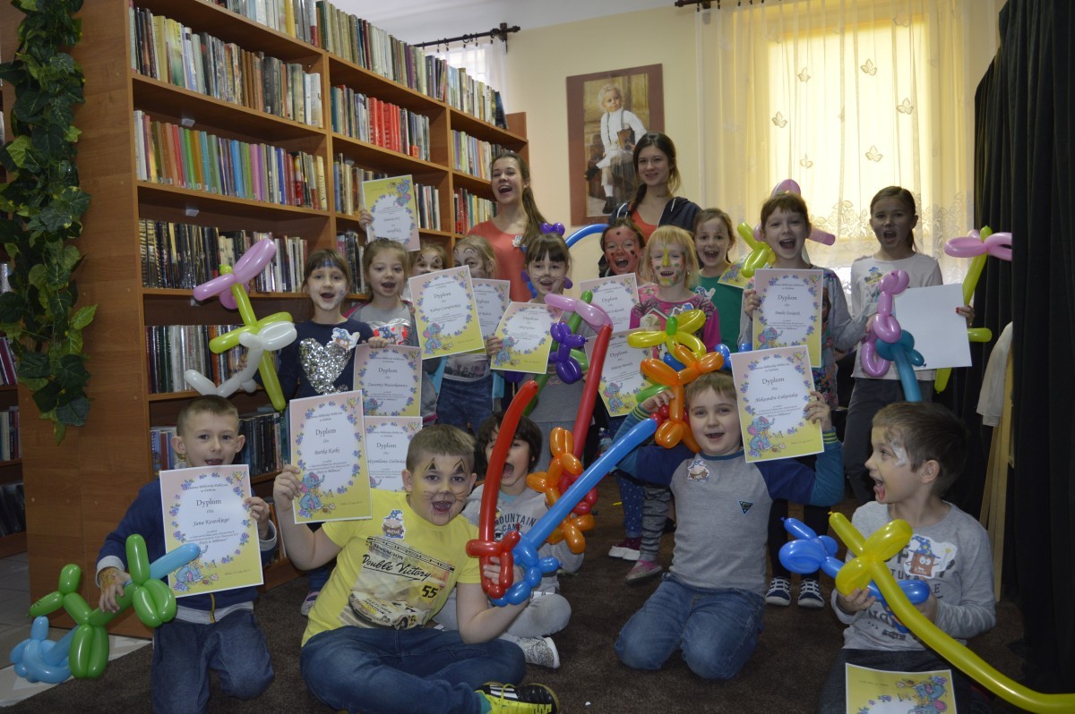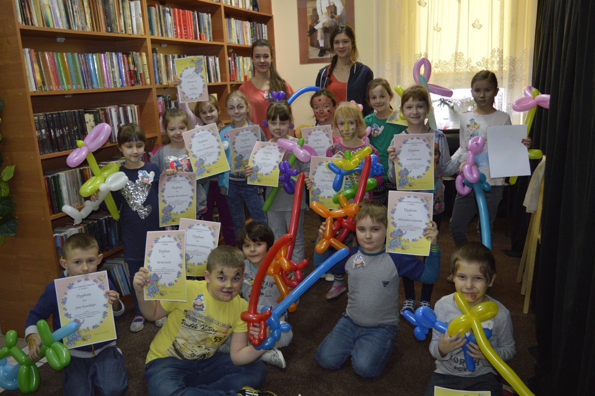 zajęcia odbywały się w bibliotece nie mogło zabraknąć czytanki dla najmłodszych. Tym razem dzieci wysłuchały historii o Kubusiu Puchatku. Nie zabrakło także balonowych zwierzaków i dyplomów za wspaniałą zabawę.
