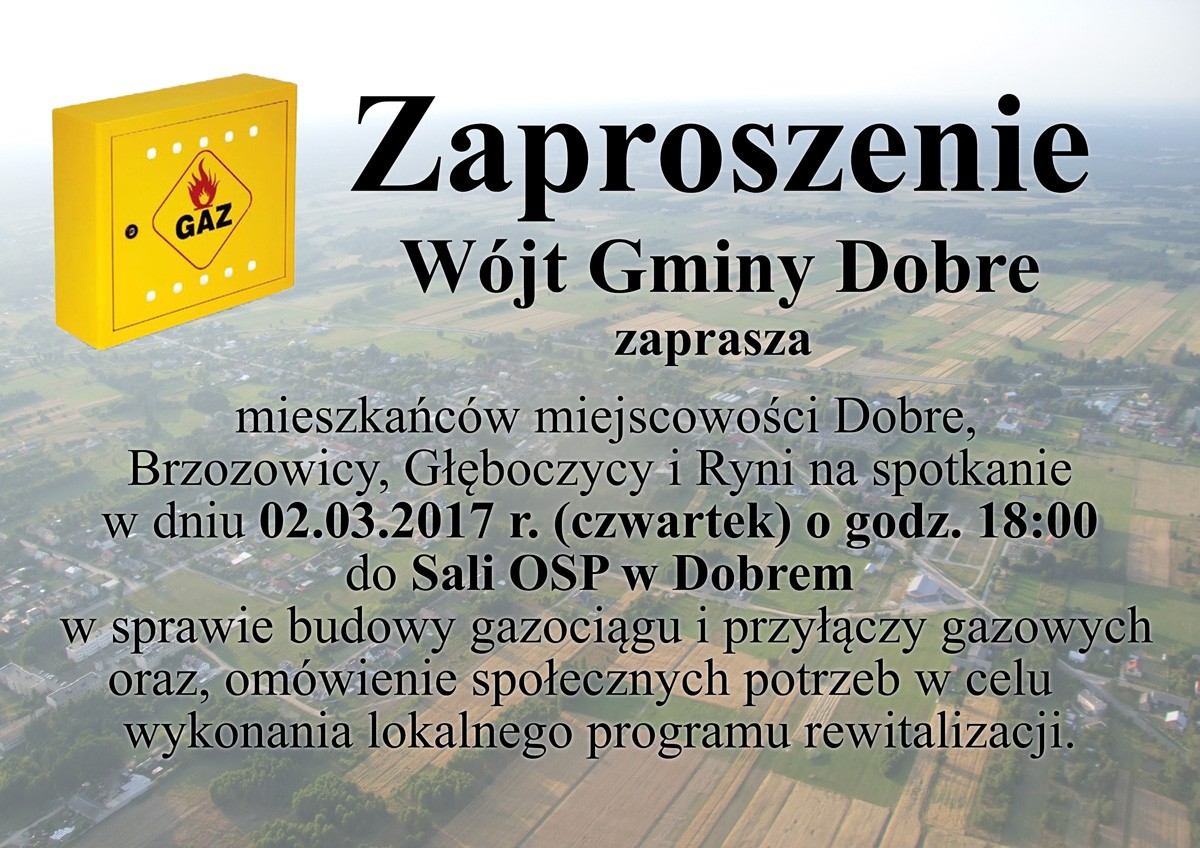 Wójt Gminy Dobre zaprasza na mieszkańców miejscowości Dobre, Brzozowicy, Głęboczycy i Ryni na spotkanie w dniu 02.03.2017 r. (czwartek) o godz. 18:00 do Sali OSP w Dobrem w sprawie budowy gazociągu i przyłączy gazowych oraz, omówienie społecznych potrzeb w celu wykonania lokalnego programu rewitalizacji.