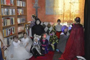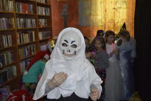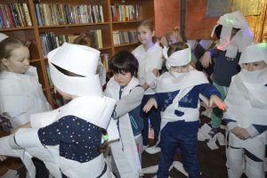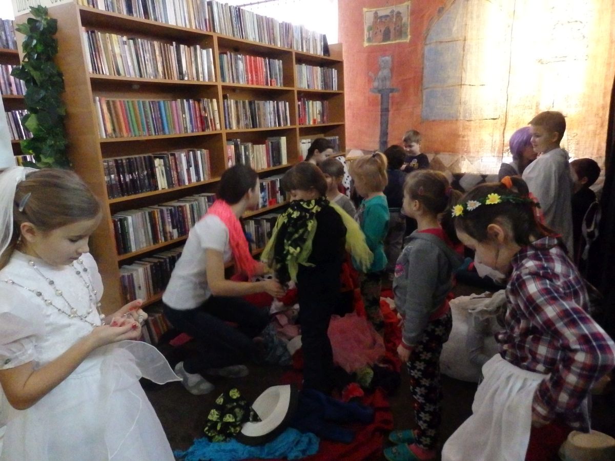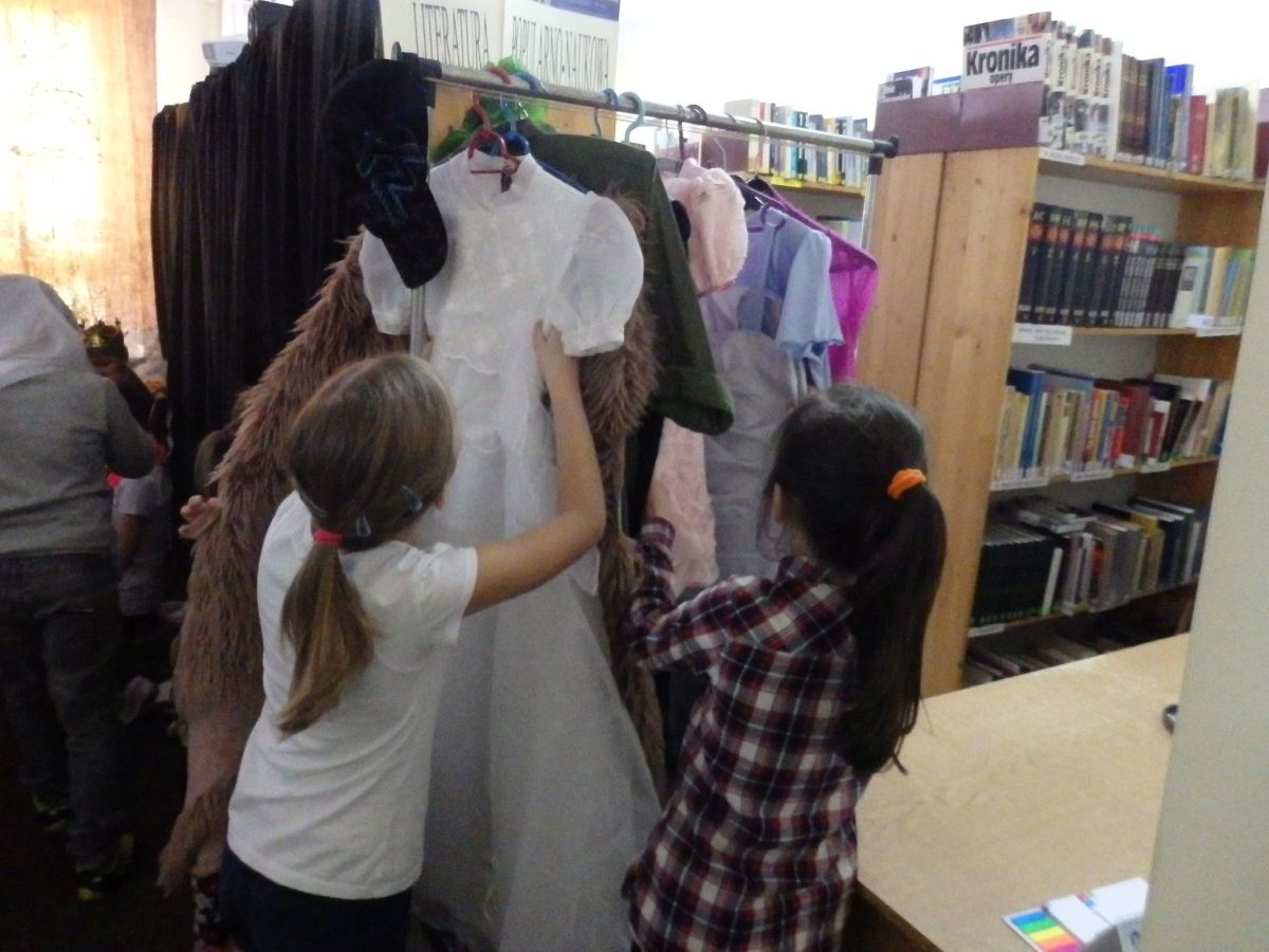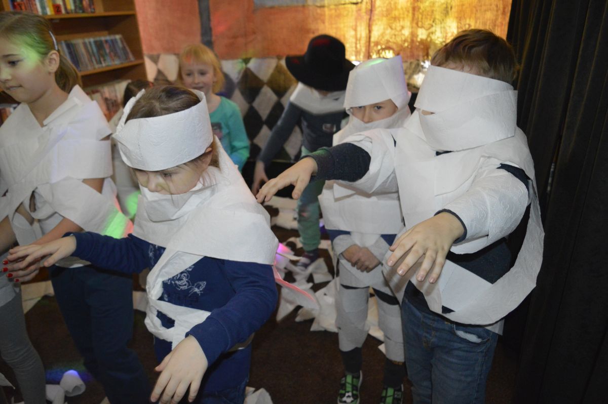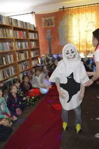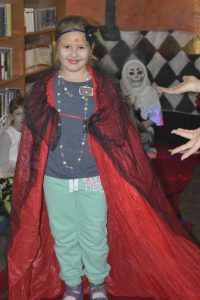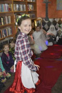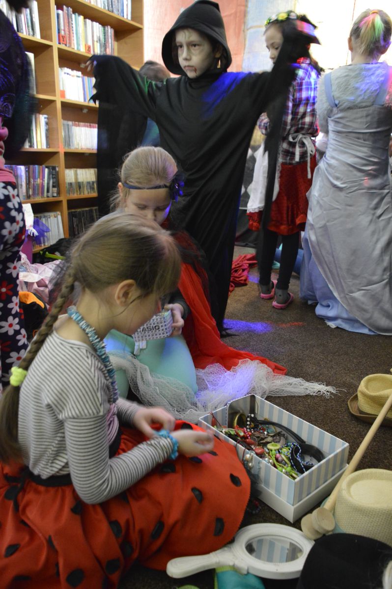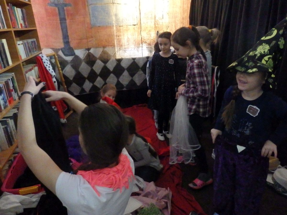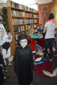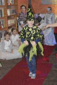 I gdzie ten kuferek? Pytali uczestnicy zajęć, które odbyły się w pierwszą środę ferii. Właśnie! Kuferek był tak wypełniony magicznymi strojami, że nawet nie było go widać! Cała zawartość czarodziejskiej skrzyni była do dyspozycji najmłodszych. Każdy mógł zamienić się w dowolną postać, by potem zaprezentować się w wielkim pokazie bajkowych stylizacji. Były księżniczki, panny młode, kopciuszek, królowa, wilk, duch i inne potwory. Ale to nie koniec przemian, maluchy jeszcze wielokrotnie wcielały się w różnych bohaterów podczas kalambur, czy bajkowych zgadywanek. Na koniec nasze grzeczne dzieci przemieniły się w straszliwe, najprawdziwsze zombie, ale spokojnie… tylko na chwilkę. Ostatecznie wszyscy uczestnicy powrócili do swojej uśmiechniętej, dziecięcej postaci.