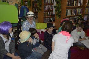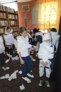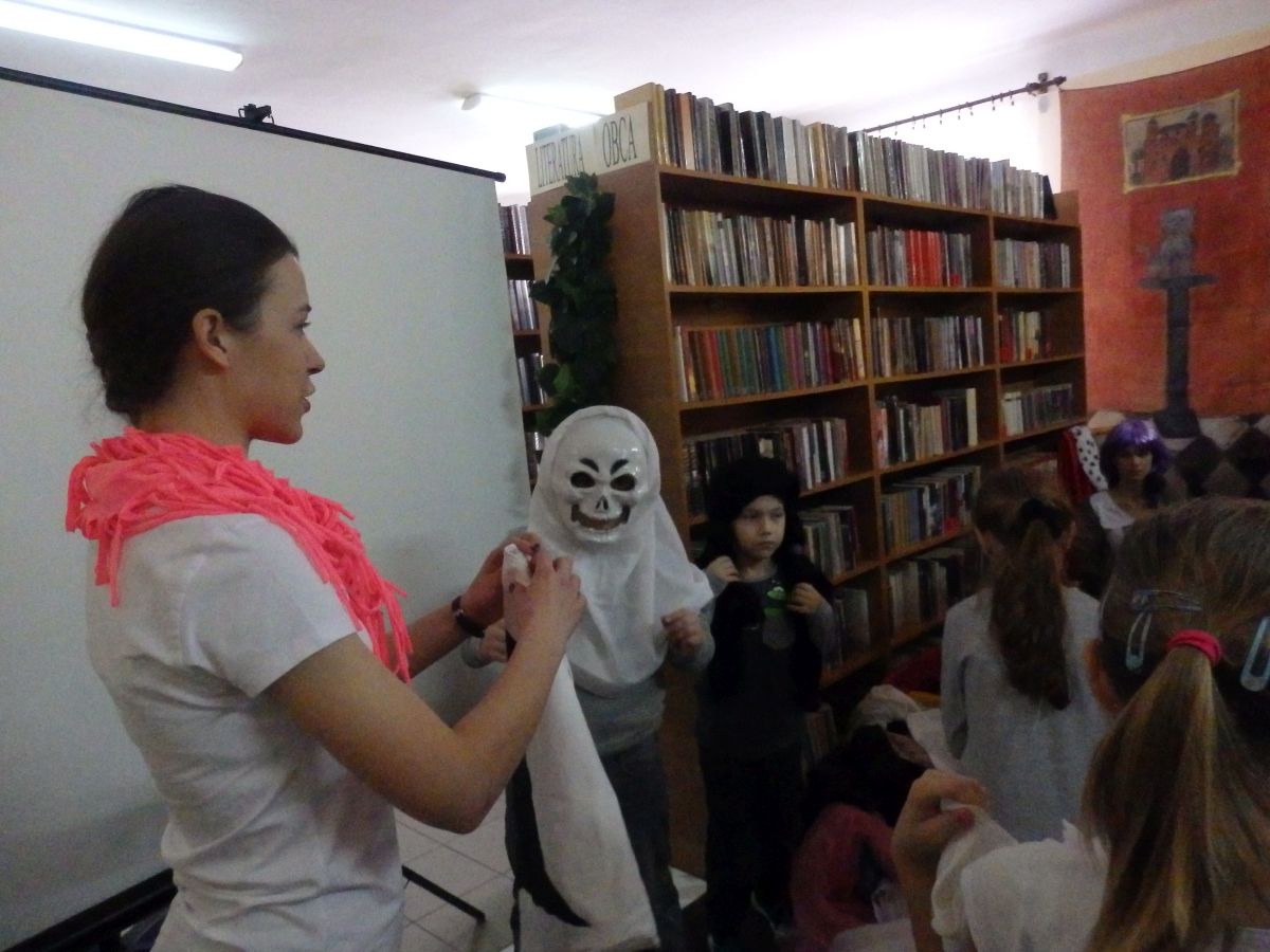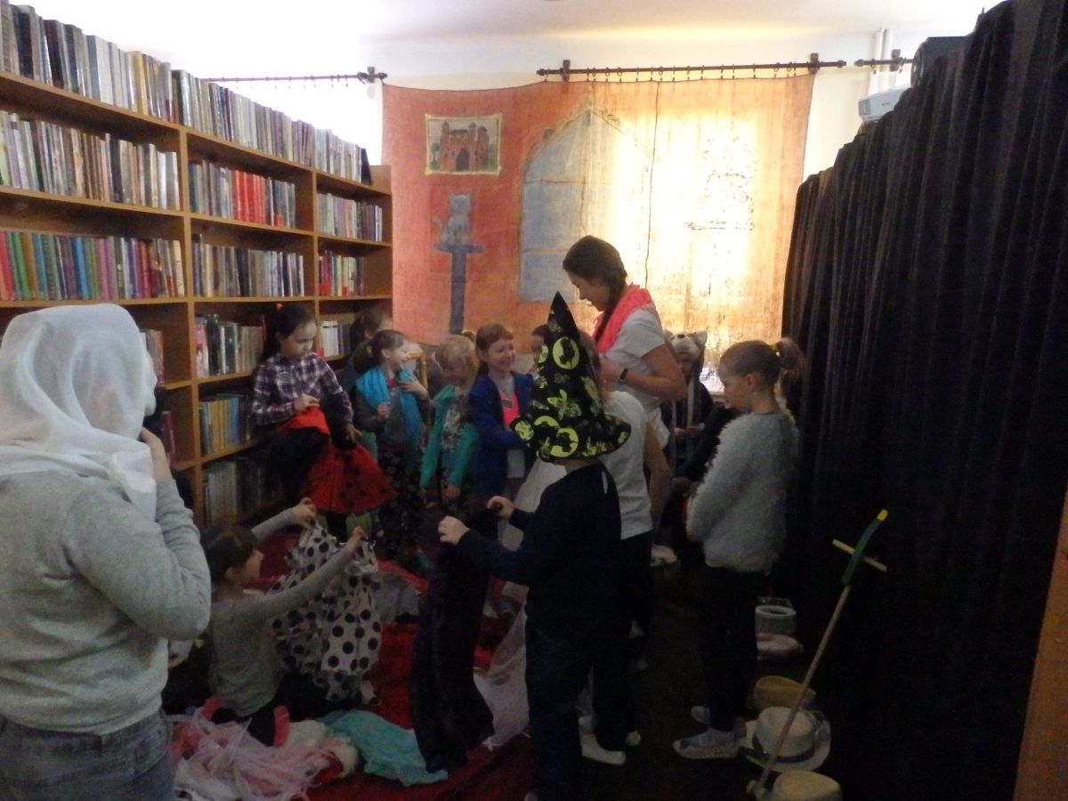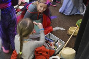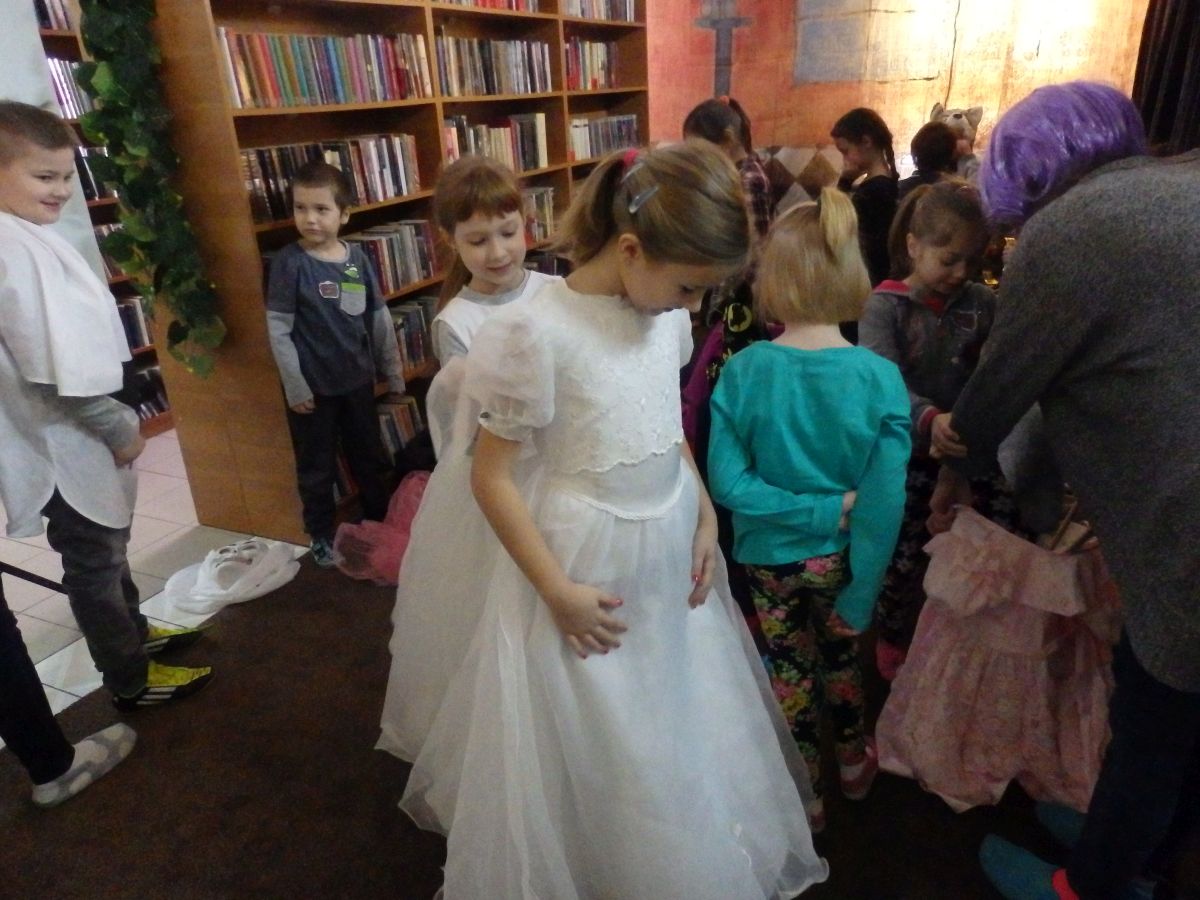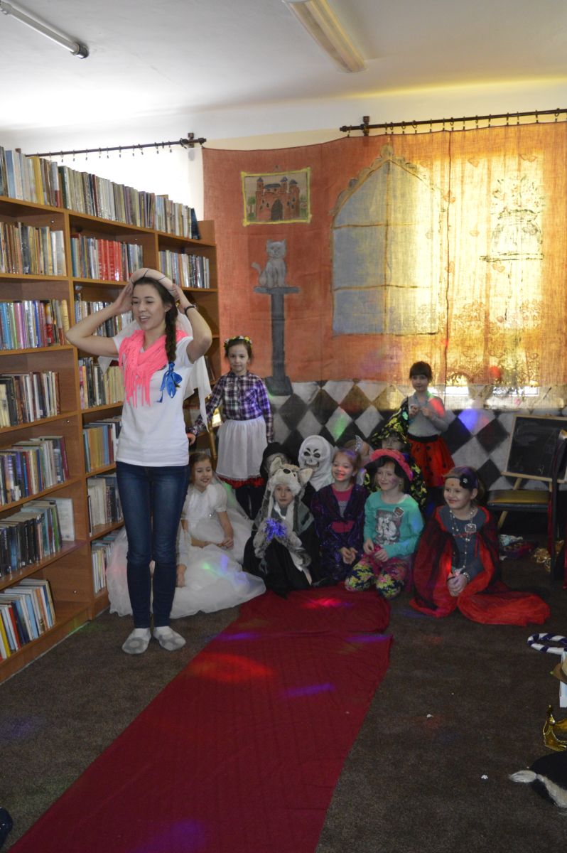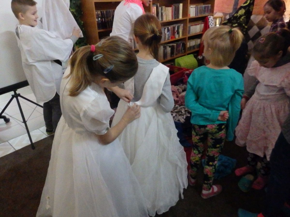 I gdzie ten kuferek? Pytali uczestnicy zajęć, które odbyły się w pierwszą środę ferii. Właśnie! Kuferek był tak wypełniony magicznymi strojami, że nawet nie było go widać! Cała zawartość czarodziejskiej skrzyni była do dyspozycji najmłodszych. Każdy mógł zamienić się w dowolną postać, by potem zaprezentować się w wielkim pokazie bajkowych stylizacji. Były księżniczki, panny młode, kopciuszek, królowa, wilk, duch i inne potwory. Ale to nie koniec przemian, maluchy jeszcze wielokrotnie wcielały się w różnych bohaterów podczas kalambur, czy bajkowych zgadywanek. Na koniec nasze grzeczne dzieci przemieniły się w straszliwe, najprawdziwsze zombie, ale spokojnie… tylko na chwilkę. Ostatecznie wszyscy uczestnicy powrócili do swojej uśmiechniętej, dziecięcej postaci.