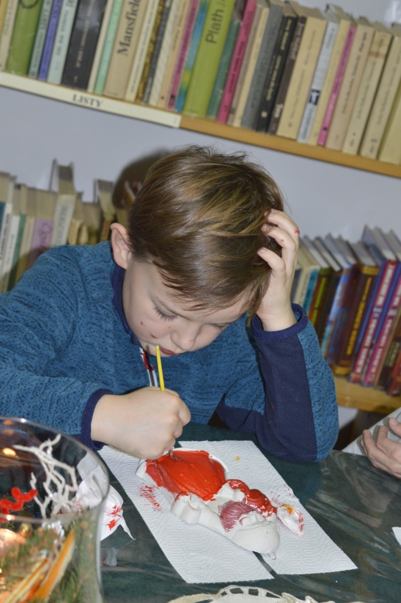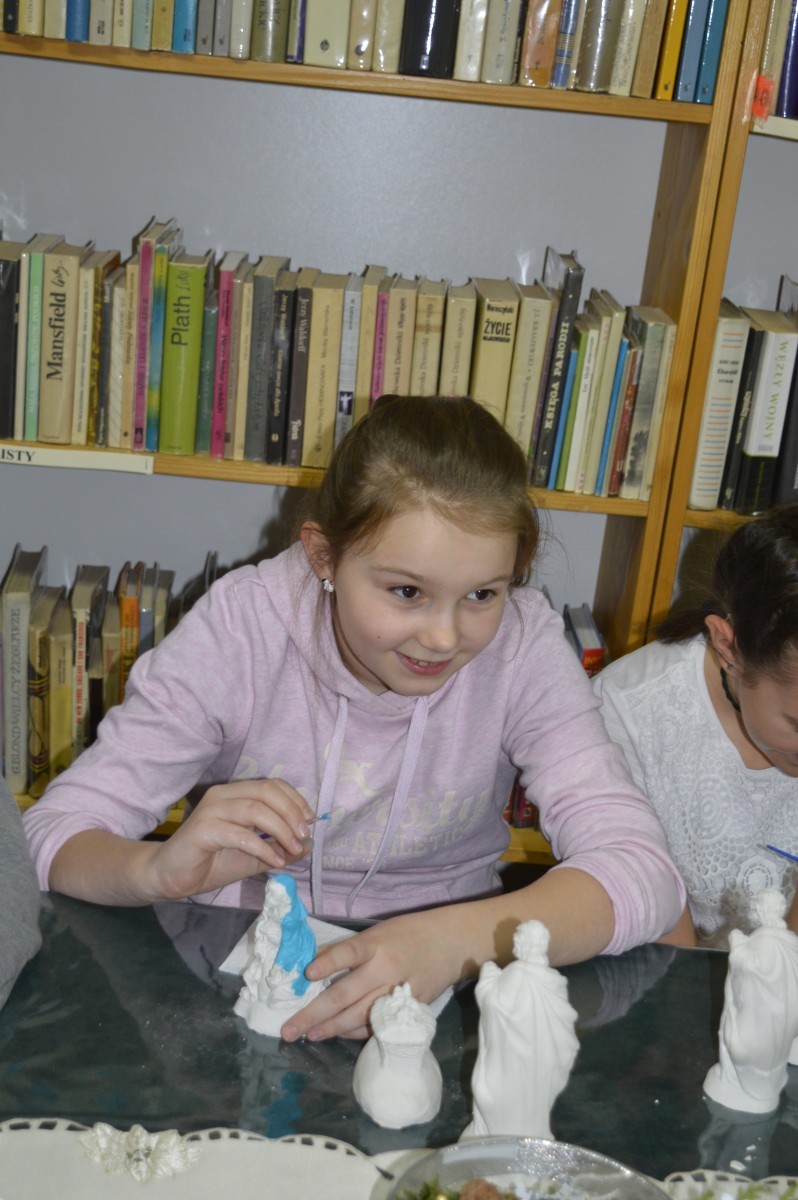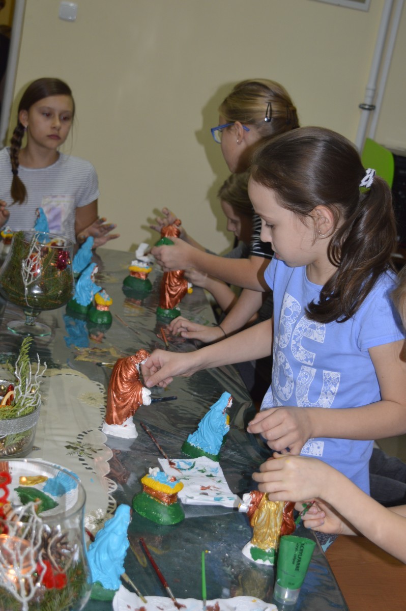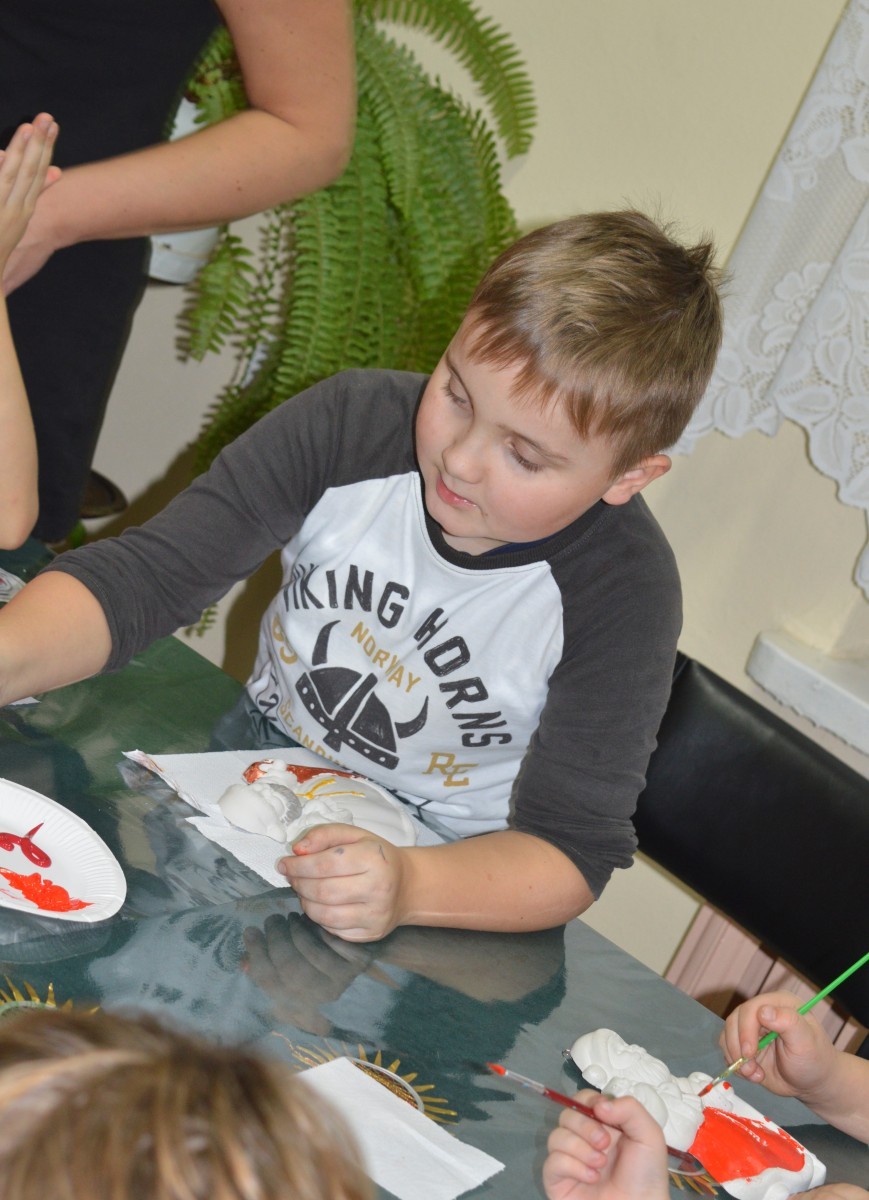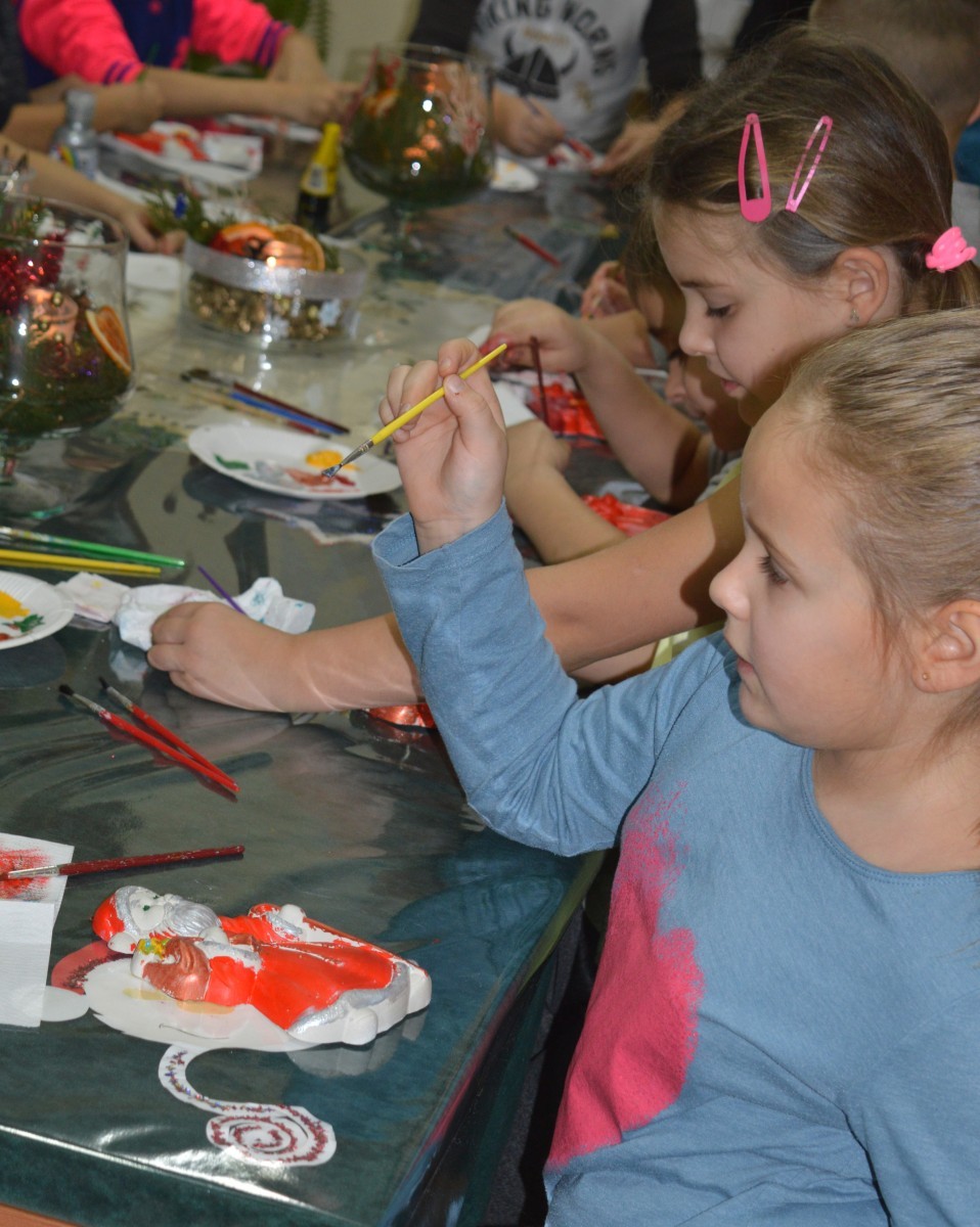 Dużo radości sprawiło dzieciom malowanie Bożonarodzeniowych figurek gipsowych. Podczas każdych zajęć dzieci śpiewały kolędy, co sprawiło, że wszyscy poczuliśmy ducha świąt. Po skończonych zajęciach dzieci mogły zabrać swoje prace do domu.