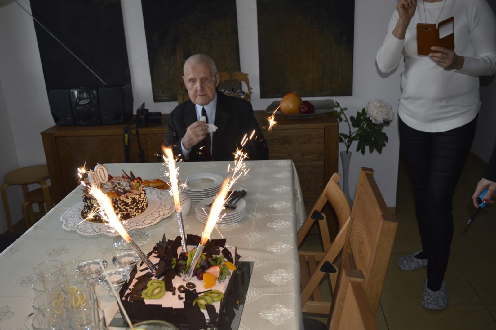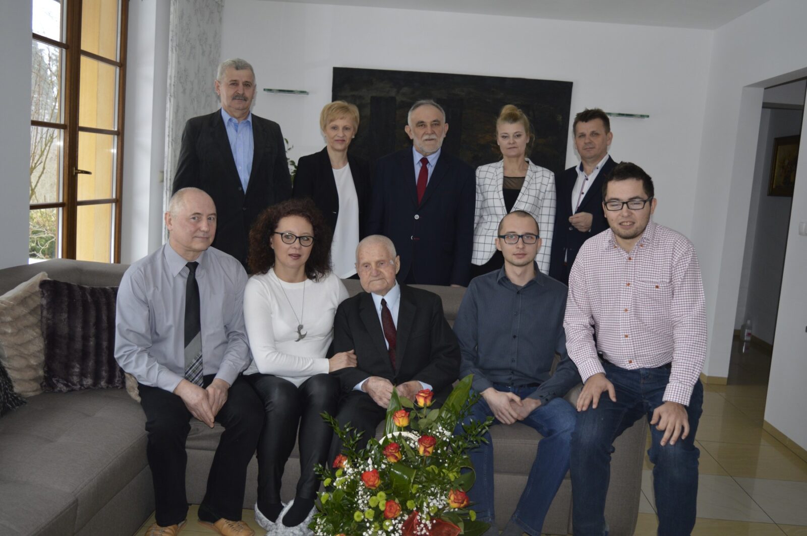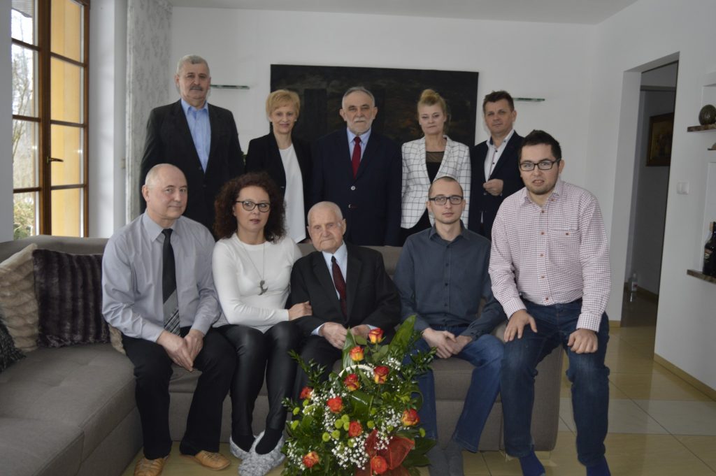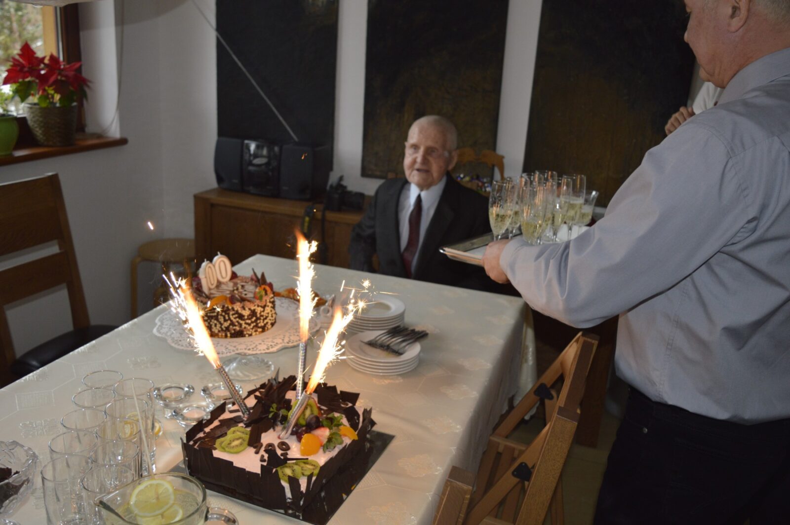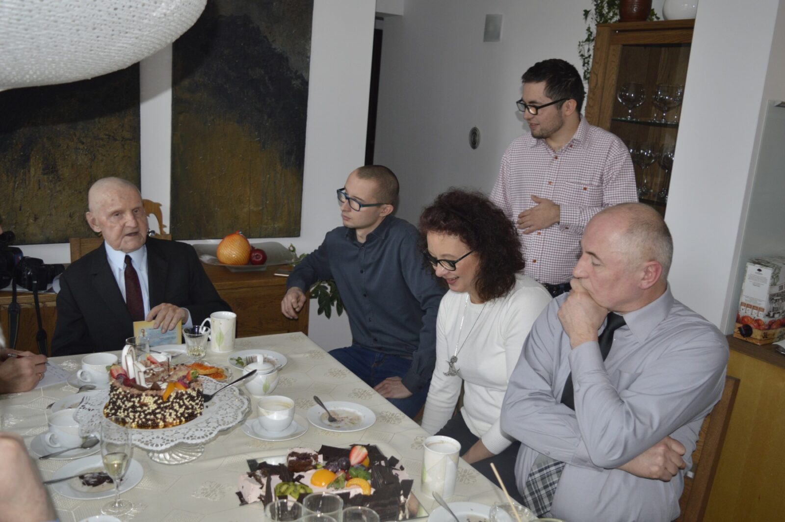 Z tej okazji w domu Dostojnego Jubilata odbyło się uroczyste spotkanie, na które przybyli niecodzienni goście: Wójt Gminy Dobre Tadeusz Gałązka, Przewodniczący Rady Gminy Waldemar Szymański, Zastępca Wójta Piotr Chmielewski, Sekretarz Urzędu Gminy Iwona Księżopolska i Kierownik USC Danuta Rawska. Obecni byli także członkowie rodziny Jubilata razem z nim mieszkający. Jako pierwszy życzenia Jubilatowi złożył Wójt Gminy. Do życzeń dołączyli się także pozostali goście, przekazując kwiaty, upominki oraz okolicznościowy tort. Kolejne gratulacje, życzenia i list gratulacyjny Jubilat otrzymał od Premiera Rządu RP Pana Mateusza Morawieckiego.