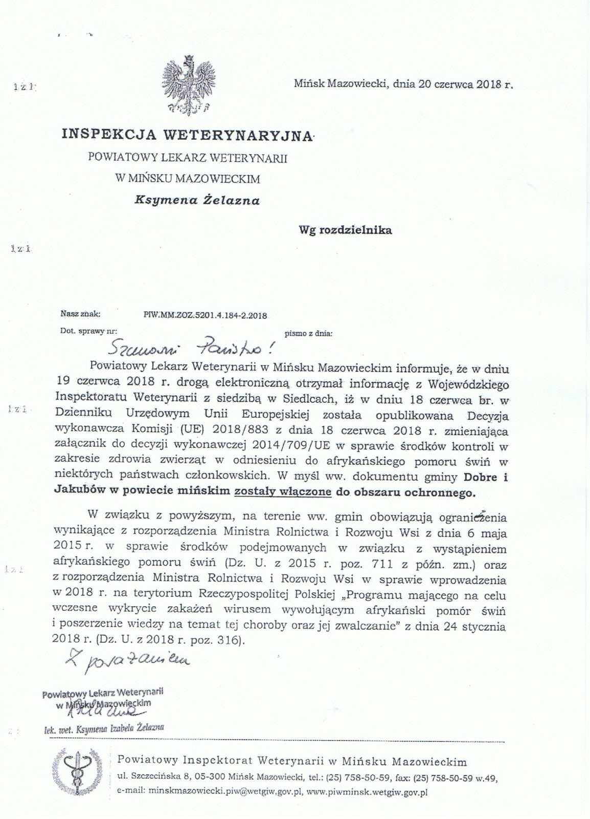 • Informacja Powiatowego Lekarza Weterynarii o włączeniu gminy Jakubów do obszaru ochronnego w związku z wystąpieniem na terenie Powiatu Mińskiego afrykańskiego pomoru swiń