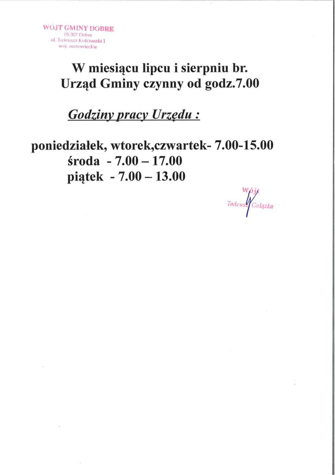 • Godziny pracy Urzędu Gminy w okresie wakacyjnym