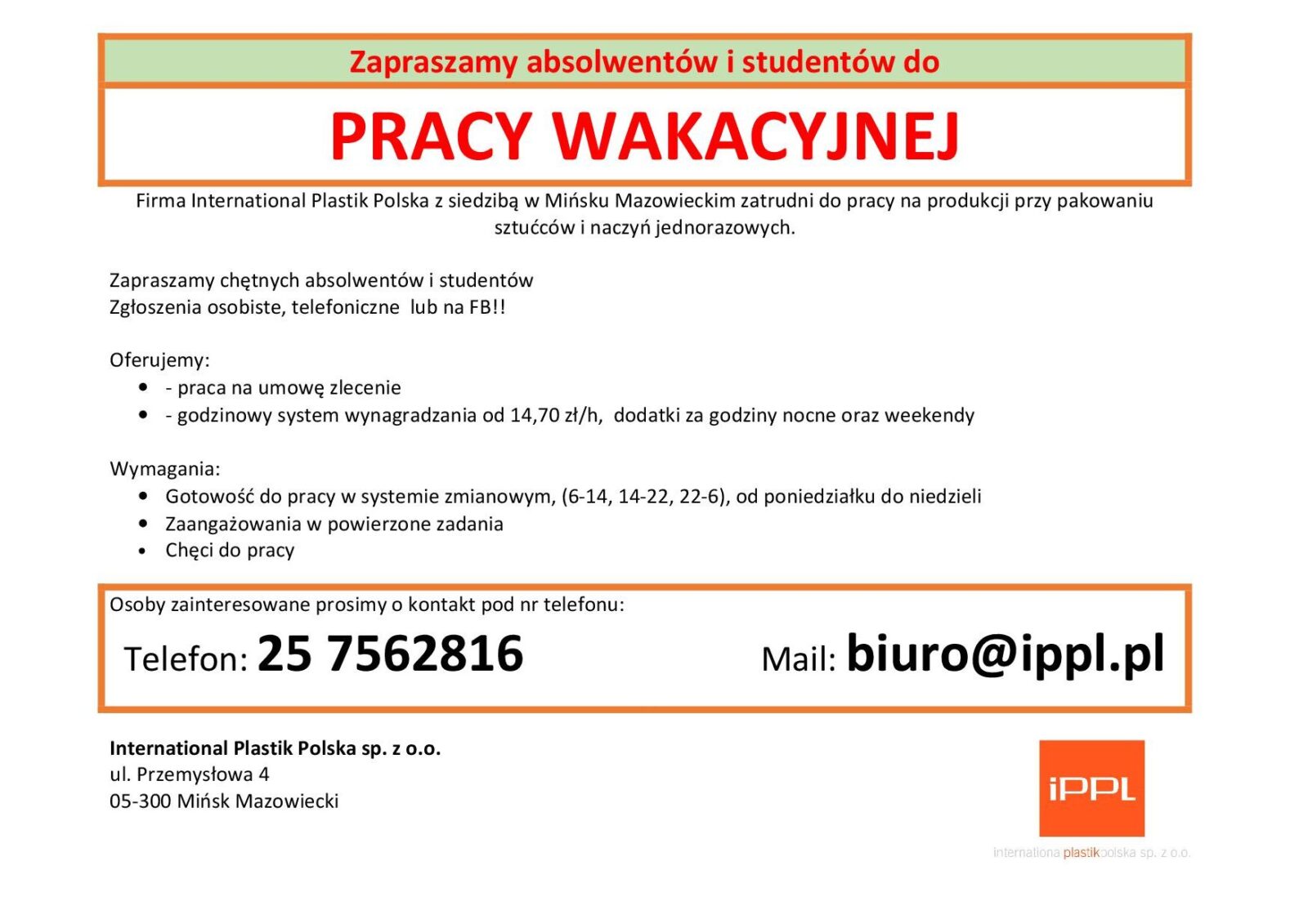 Firma International Plastik Polska z siedzibą w Mińsku Mazowieckim zatrudni do pracy na produkcji przy pakowaniu sztućców i naczyń jednorazowych.