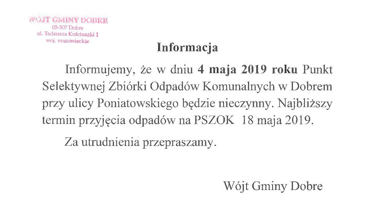 • Nieczynny PSZOK w dniu 4 maja 2019 roku