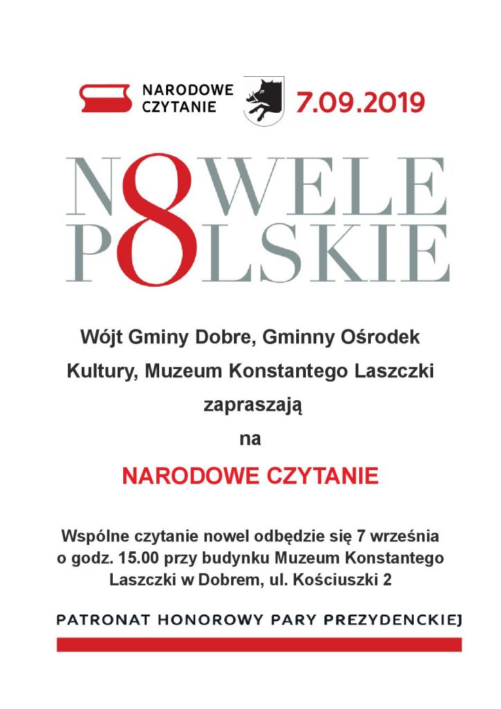 Zapraszamy wszystkich mieszkańców do udziału w Narodowym Czytaniu Nowel polskich. Spotykamy się 7 września 2019 r., o godz. 15.00 przy Muzeum Konstantego Laszczki w Dobrem. Czytać będą: władze samorządowe, przedstawiciele instytucji, seniorzy, młodzież oraz dzieci. Zachęcamy do zabrania ze sobą własnego egzemplarza noweli, na którym będzie można otrzymać okolicznościową pieczęć upamiętniającą tegoroczną edycję.