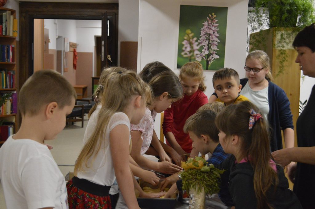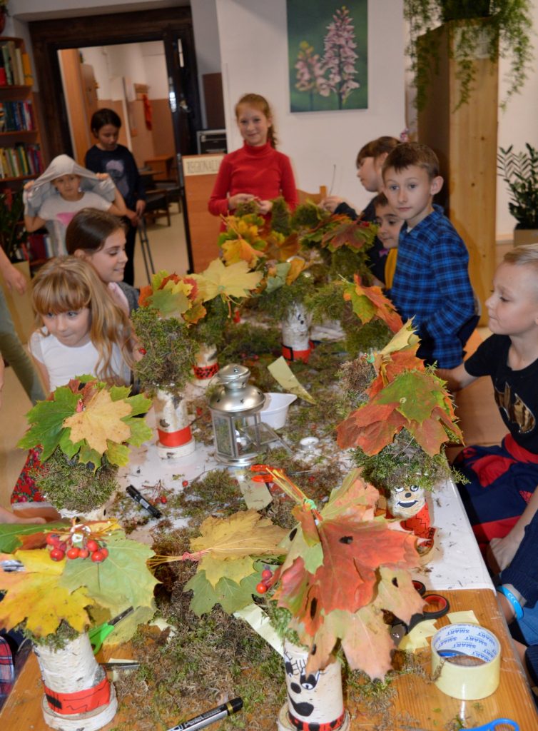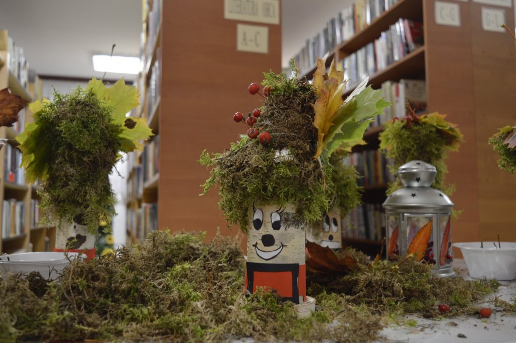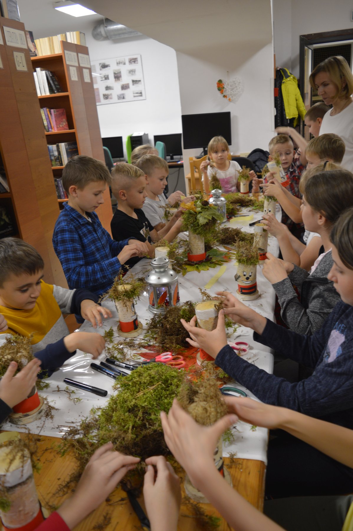 Później każdy uczestnik zabrał się do zrobienia leśnego skrzata. Pracy było dużo, zabawy i śmiechu jeszcze więcej. Na koniec zajęć bibliotekę ogarnął niesamowity zapach szarlotki, którą dzieci wspólnie zrobiły. Po degustacji pysznego ciasta z lodami, jak stwierdziły dzieci, każdy z leśnym skrzatem mógł wrócić do domu.