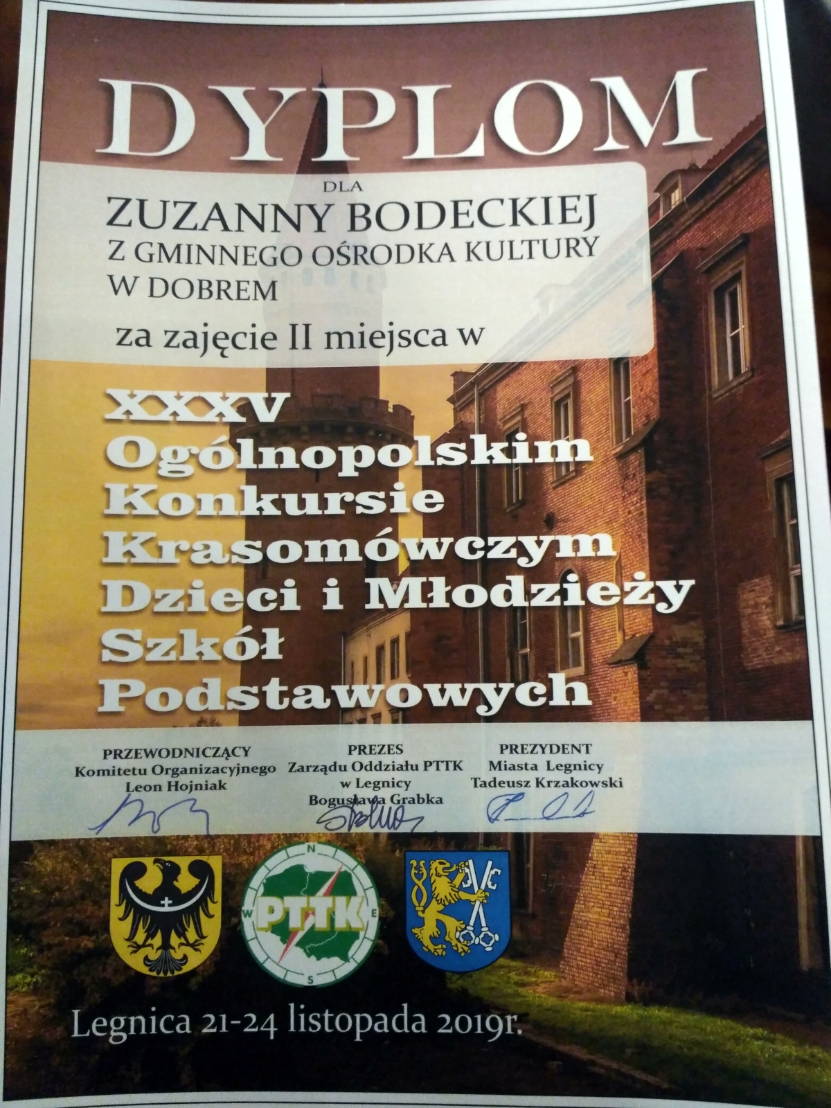 Mamy przyjemność poinformować, że Zuzanna Bodecka, reprezentantka naszej Gminy, powiatu mińskiego i województwa mazowieckiego, zdobyła 2 miejsce na Ogólnopolskim Konkursie Krasomówczym w Legnicy, organizowanym przez PTTK.