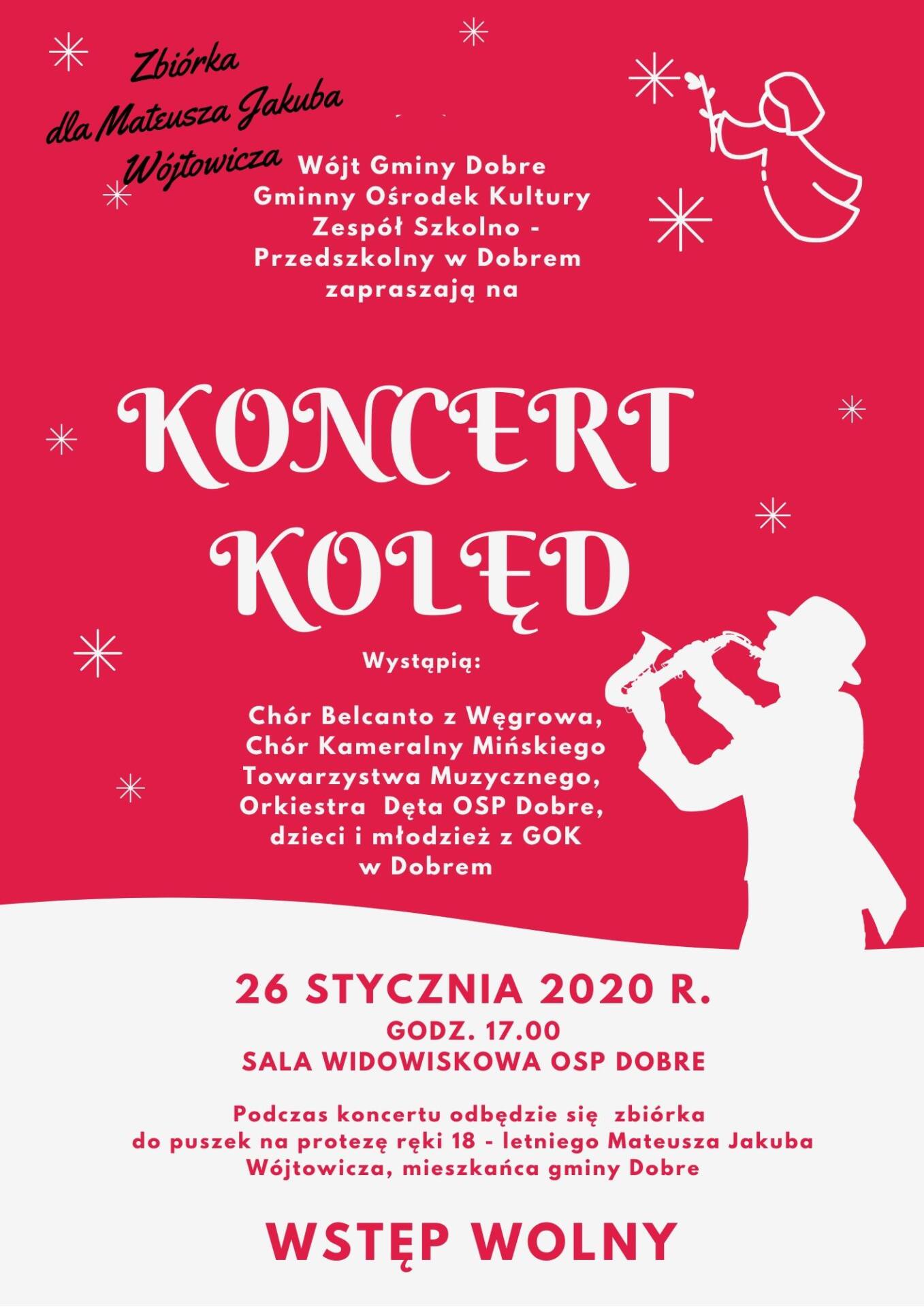 26 stycznia 2020 r. o godz. 17.00, w sali widowiskowej OSP Dobre odbędzie się Koncert Kolęd. Wystąpią wspaniali artyści: Chór Belcanto z Węgrowa, Chór Kameralny Mińskiego Towarzystwa Muzycznego, Orkiestra Dęta OSP Dobre oraz dzieci i młodzież z GOK w Dobrem. Podczas koncertu odbędzie się zbiórka do puszek na protezę ręki 18 – letniego Mateusza Jakuba, mieszkańca gminy Dobre. Serdecznie zapraszamy do udziału w wydarzeniu oraz wsparcia Kuby. Wstęp wolny!!!