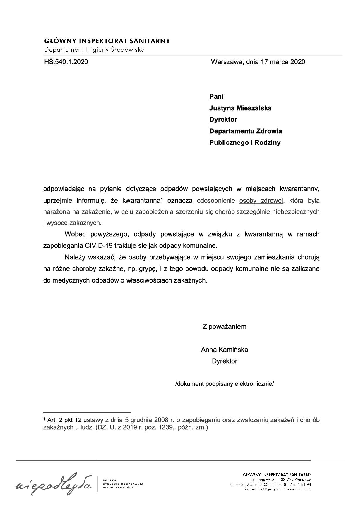 w związku z licznymi pytaniami dotyczącymi charakteru odpadów powstających w gospodarstwach domowych objętych kwarantanną w ramach działań związanych z przeciwdziałąniem COVID-19 w załączeniu przesyłam do wykorzystania i ewentualnie dalszego udostępniania pismo Głównego Inspektoratu Sanitarnego dotyczące tych odpadów.