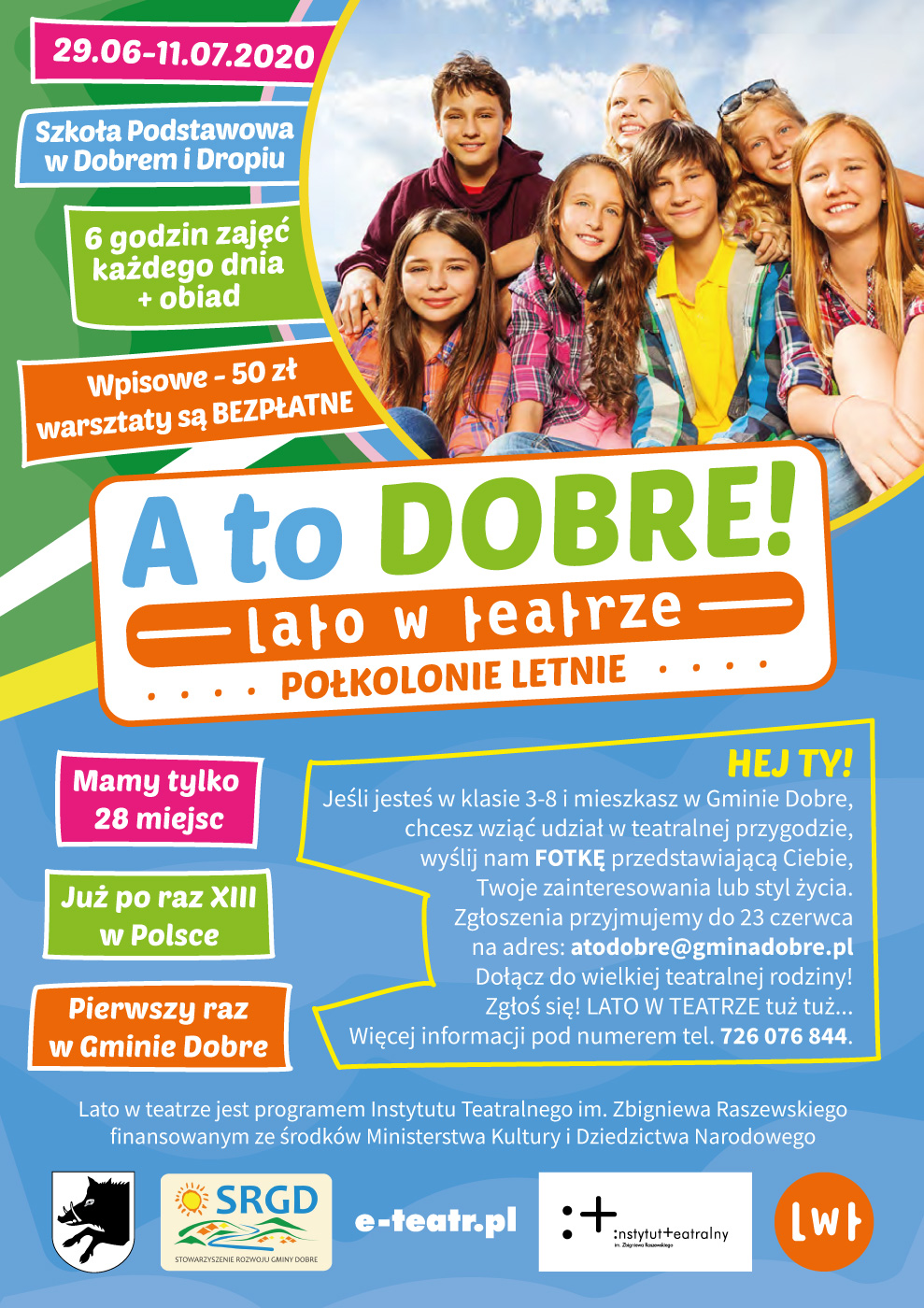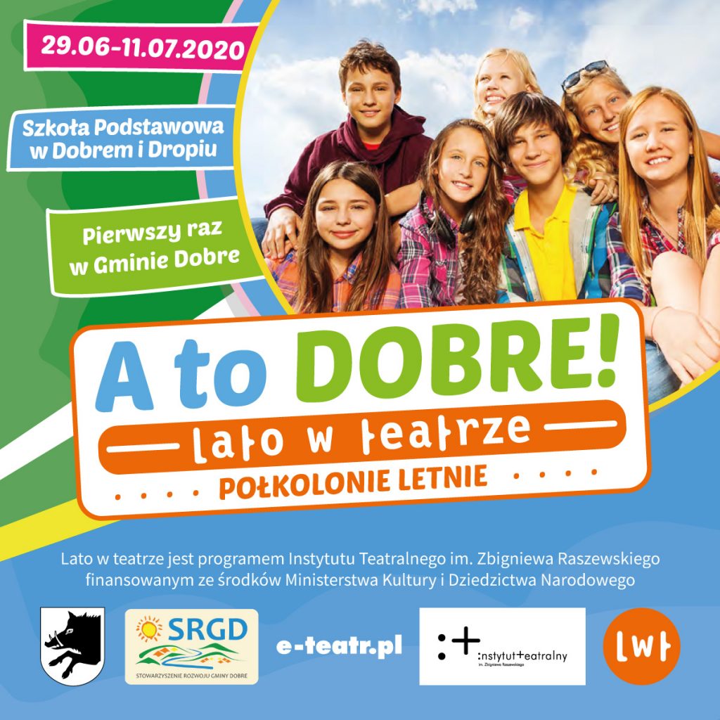 Z przyjemnością informujemy, że w lipcu tego roku na terenie Gminy Dobre odbędą się półkolonie, przeznaczone dla 28 uczniów klas IV-VIII. Półkolonie zostaną zrealizowane w ramach projektu pt. „A to Dobre!”, który otrzymał dofinansowanie z programu Instytutu Teatralnego im. Zbigniewa Raszewskiego „Lato w teatrze 2020” i jest finansowany ze środków Ministerstwa Kultury i Dziedzictwa Narodowego.