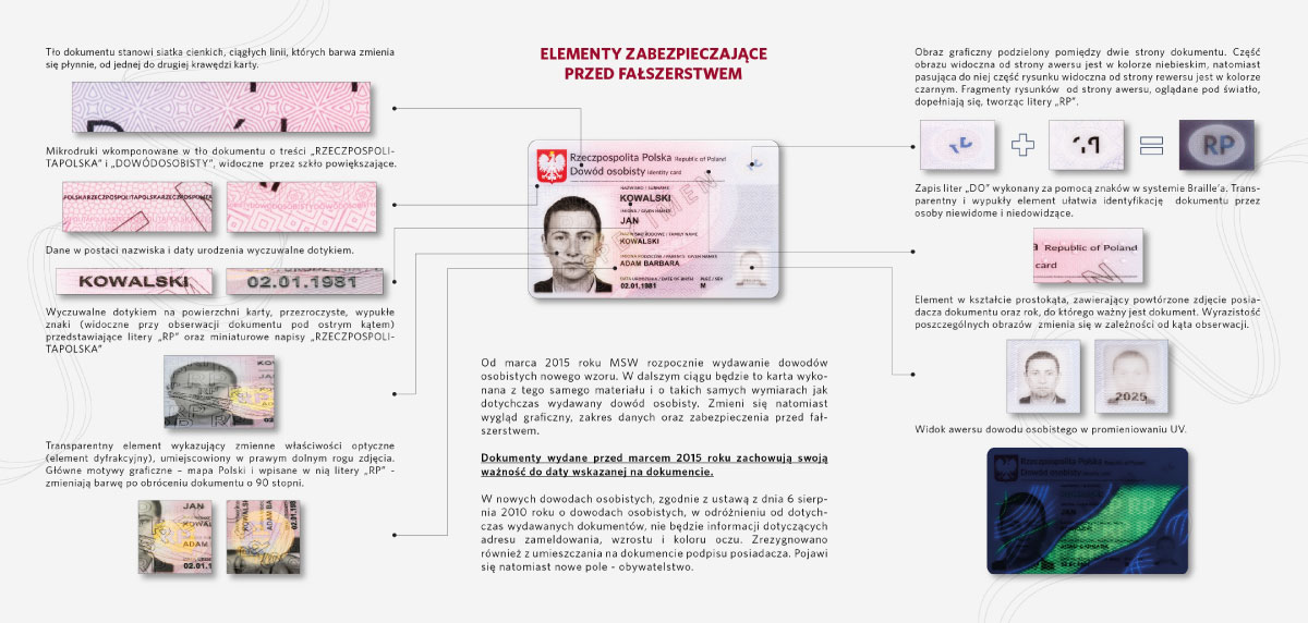 W związku z wejściem w życie z dniem 1 marca 2015 roku nowych przepisów dotyczących dowodów osobistych, a co za tym idzie, nowego wzoru dowodu osobistego, poniżej przedstawiamy elektroniczną wersję ulotki informacyjnej dotyczącej zabezpieczeń nowego dowodu osobistego.