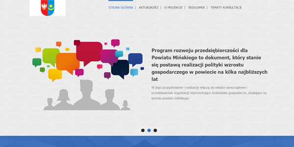 W ramach realizowanego projektu pn. „Przygotowanie modelowego programu rozwoju przedsiębiorczości w Powiecie Mińskim” realizowanego przezStarostwo Powiatowe w Mińsku w partnerstwie z Fundacją Europejskie Centrum Przedsiębiorczości oraz Związkiem Pracodawców Warszawy i Mazowsza powstała Platforma Konsultacji Społecznych dostępna pod adresem: http://konsultacje-powiatminski.zpwim.pl/