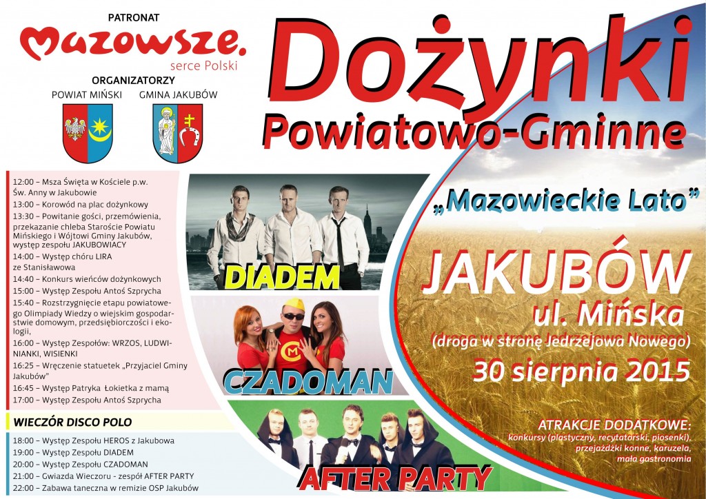 13:30 – Powitanie gości, przemówienia, przekazanie chleba Staroście Powiatu Mińskiego i Wójtowi Gminy Jakubów, występ zespołu JAKUBOWIACY