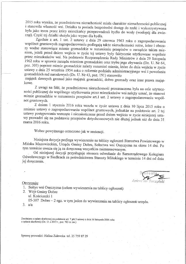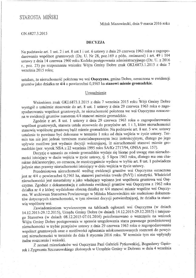 • Decyzja Starosty Mińskiego w sprawie nieruchomości położonej we wsi Osęczyzna